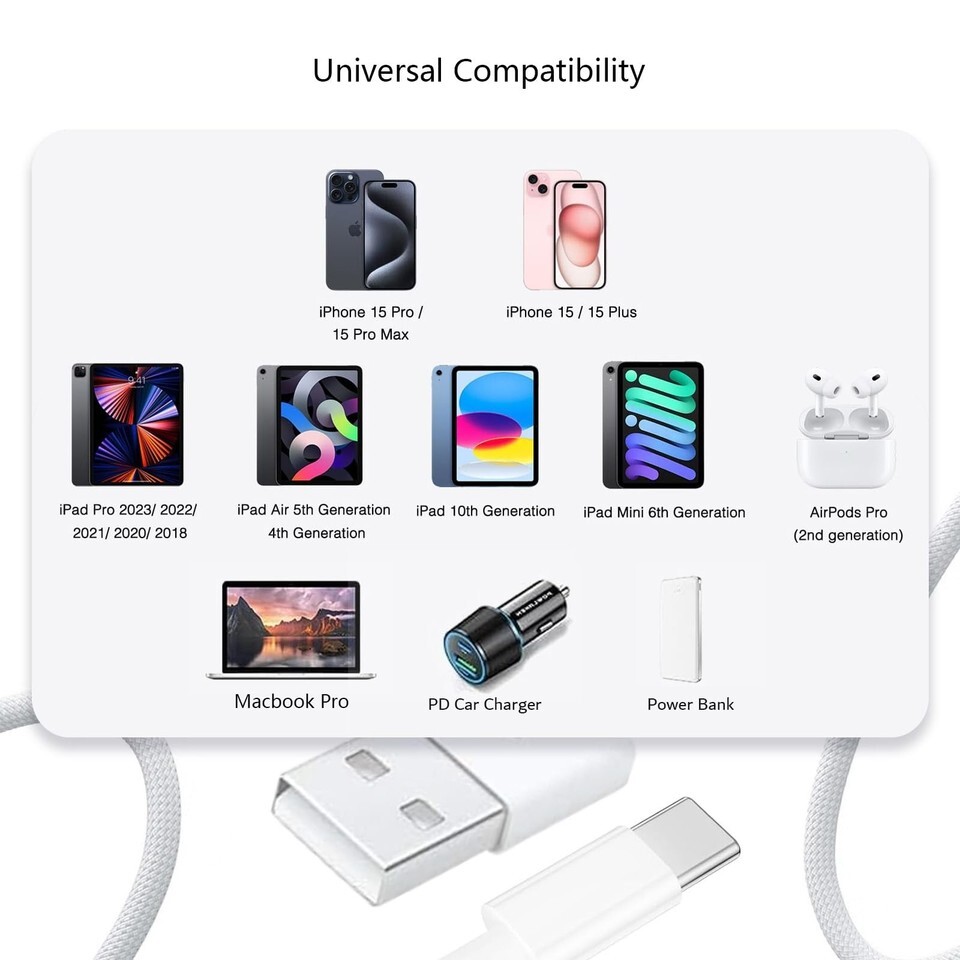 Compatible Carplay USB-C Cable 60W Charger for Apple iPhone 15 Pro Max