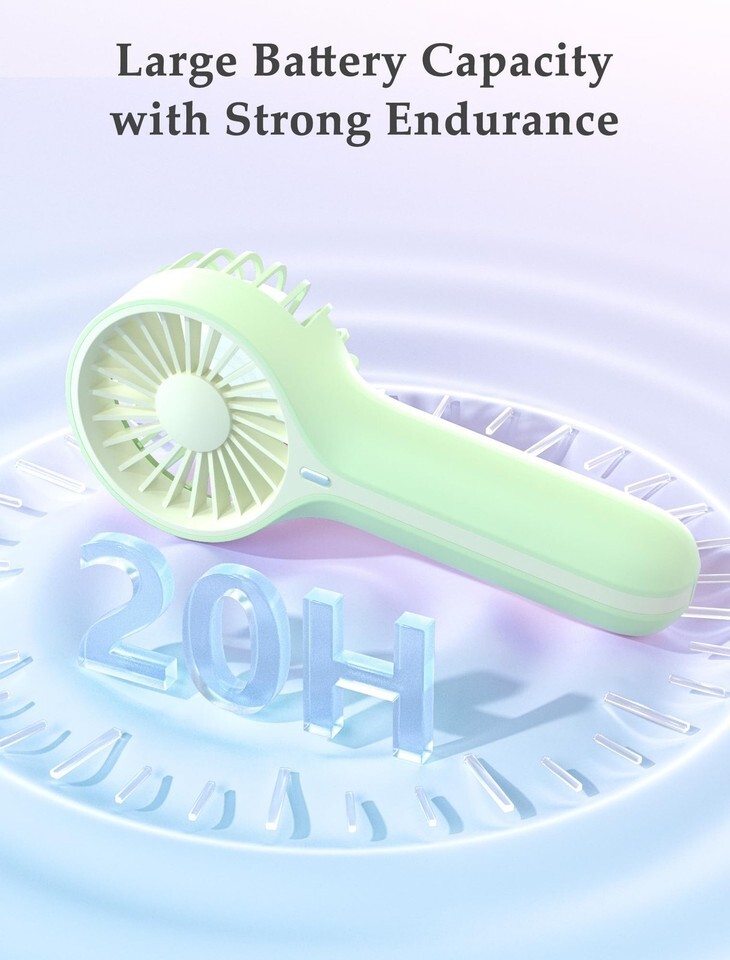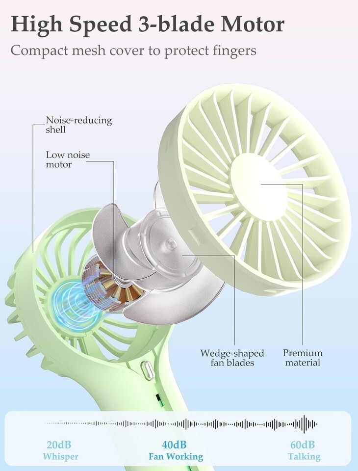 Powerful and super-quietThe portable hand fan has a powerful built-in brushless motor that allows the fan blades to rotate at high speed to generate strong wind power.Ultra-quiet operation, the small hand fan provides a cool breeze but never disturbs you.