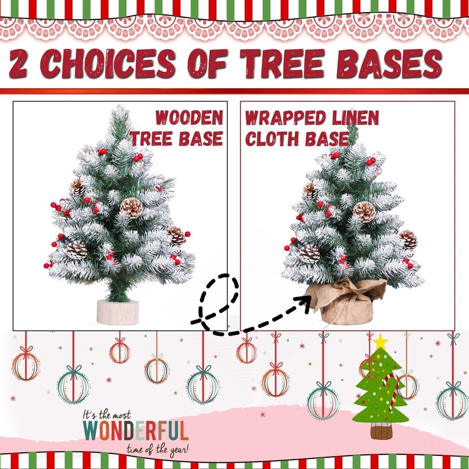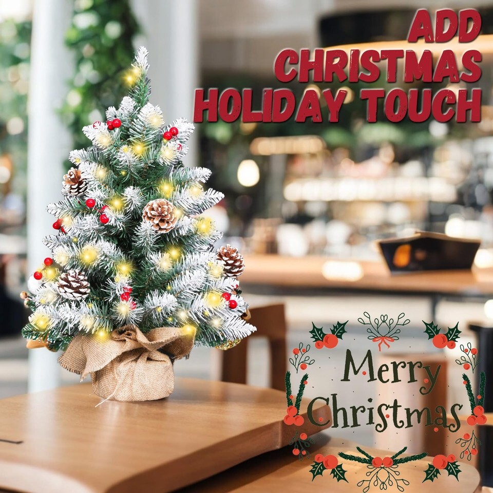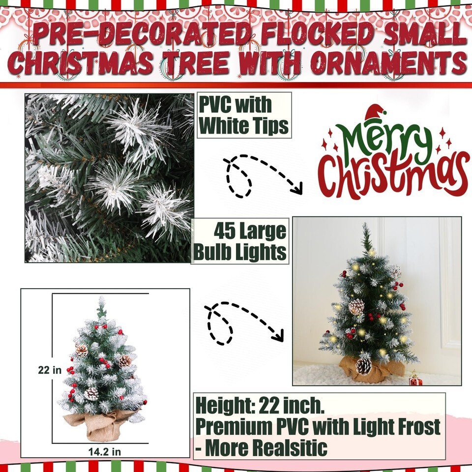 Pre-decorated Desktop Mini Christmas Tree with Lights: This mini Christmas tree 2ft is adorned with 12 strands of beautiful berries and pinecones. 80 flocking snow frost branches make this small tree fuller and more attractive. The flocking snow frost branches won't shed, so you don't have to worry about making a mess on your desktop or floor