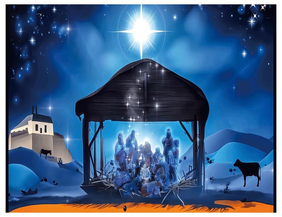 The nativity backgrounds are printed at a high resolution using inkjet printing and digital fabrication equipment. The prayers on the backdrop are positioned at a distance to achieve the most realistic effect.
