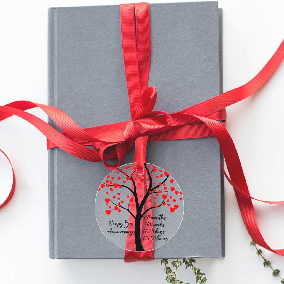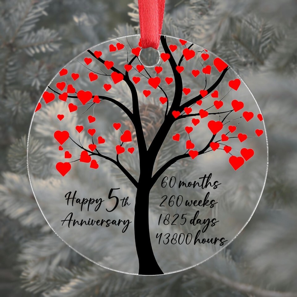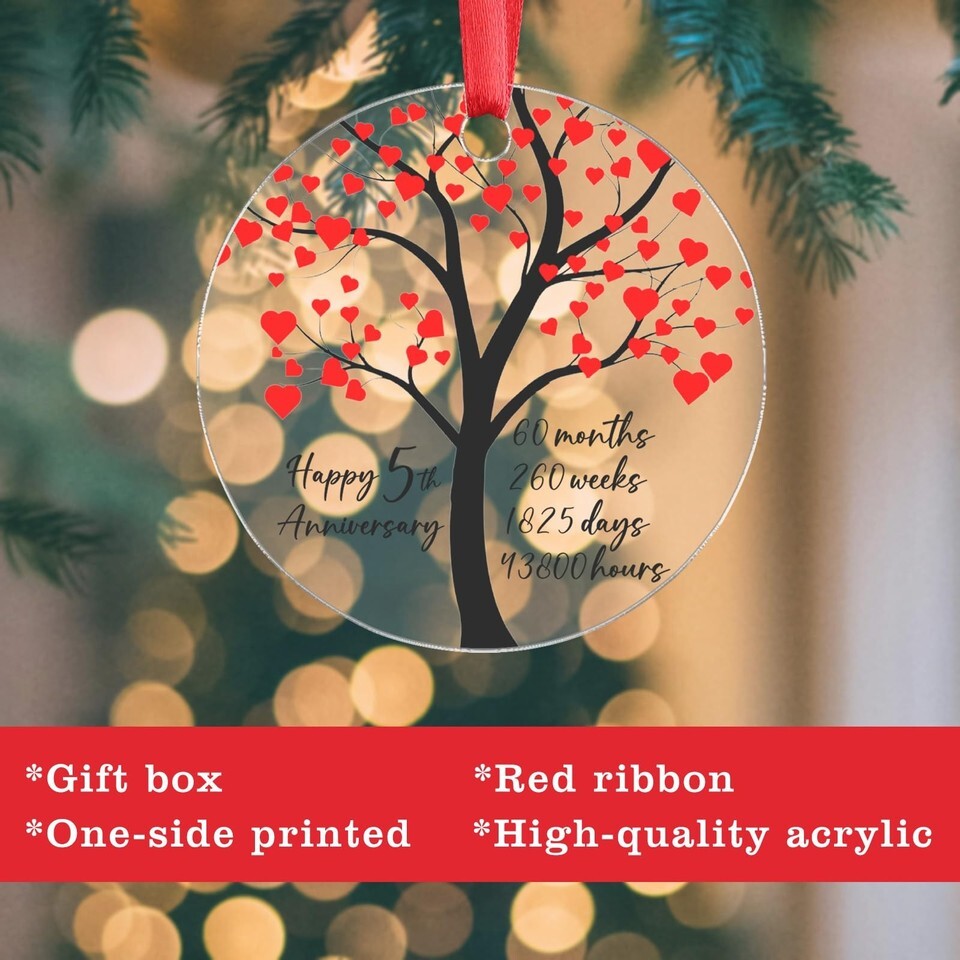 1.[5 year anniversary gift for men women]:This acrylic ornament is engraved with: "happy 5th anniversary 60 months 260 weeks 1825 days 43800 hours", anniversary gift for her him women men wife husband boyfriend girlfriend couple.