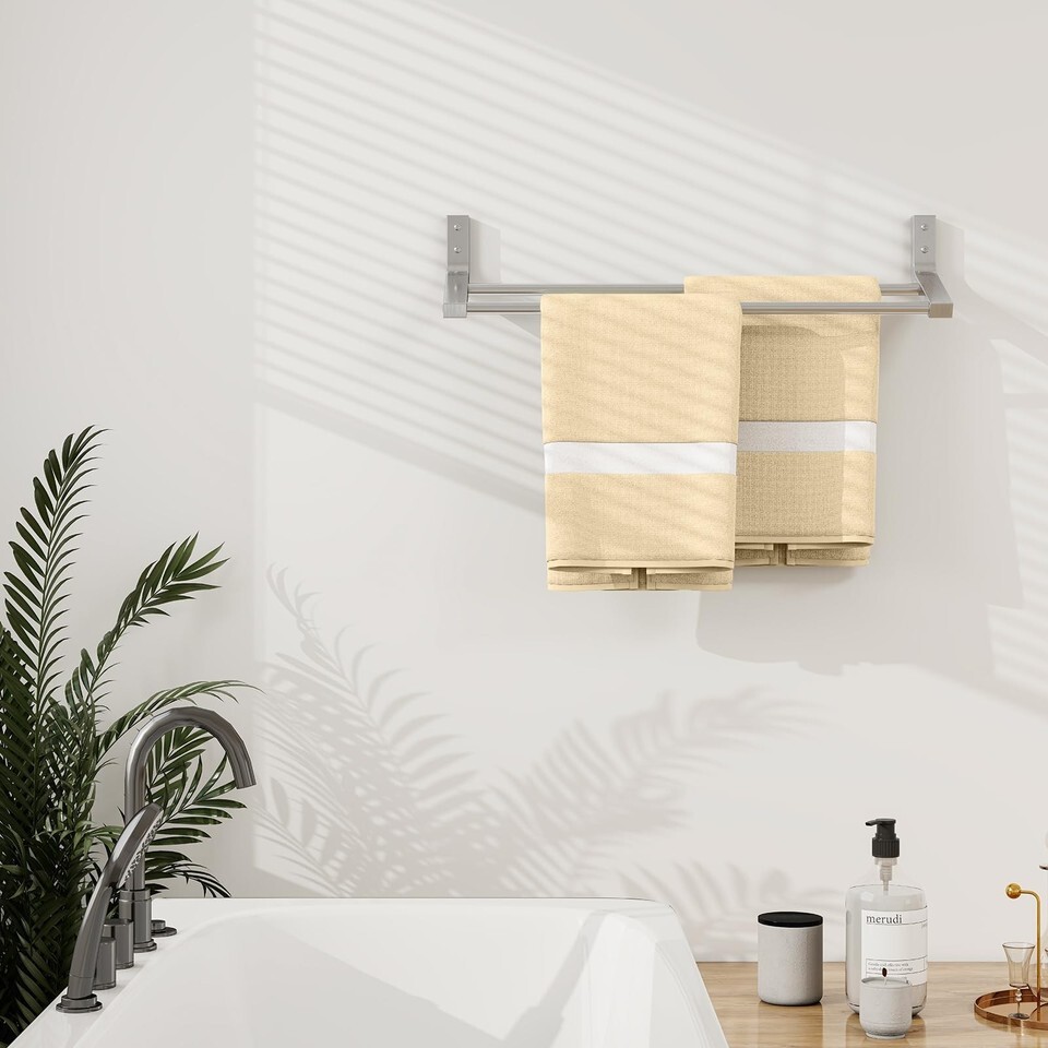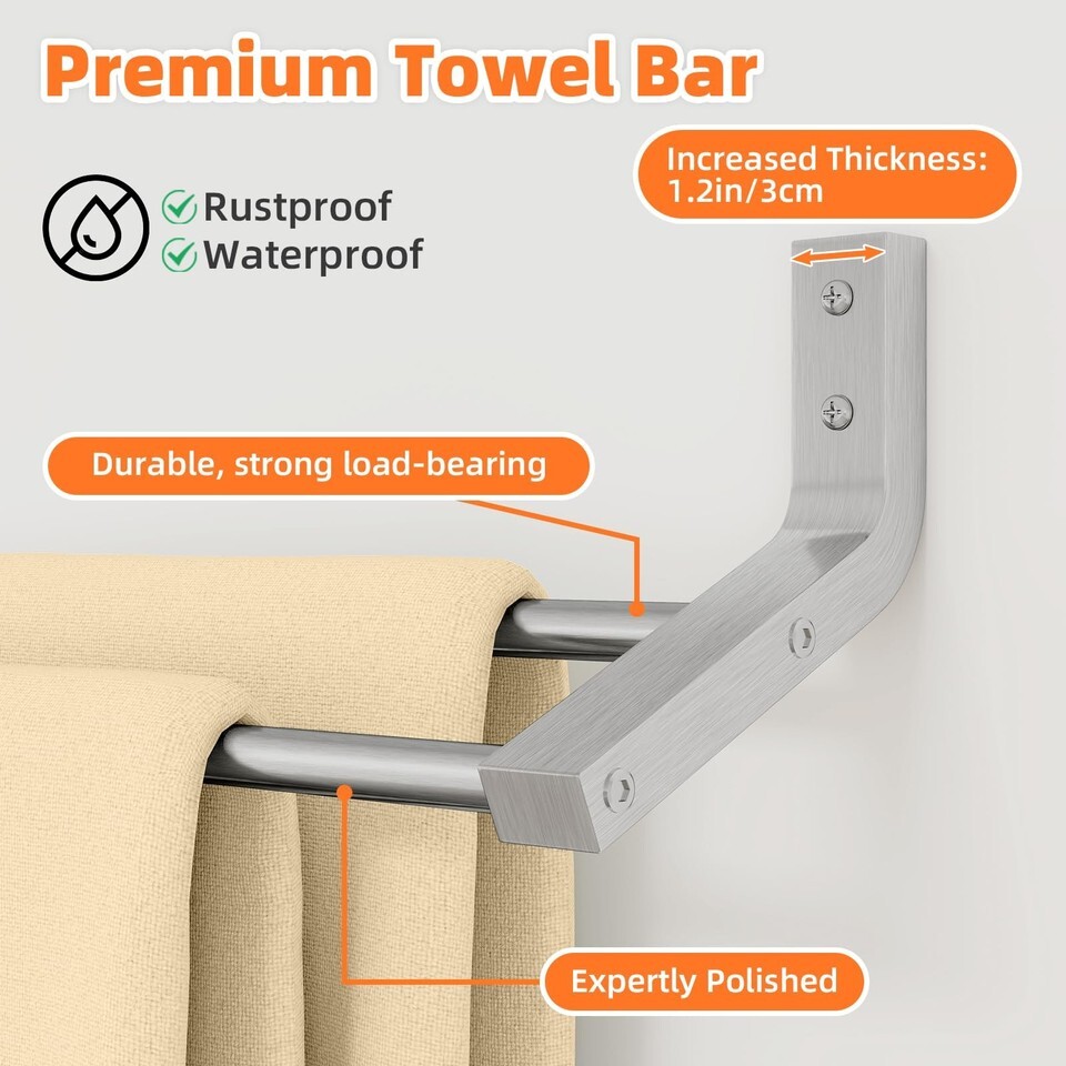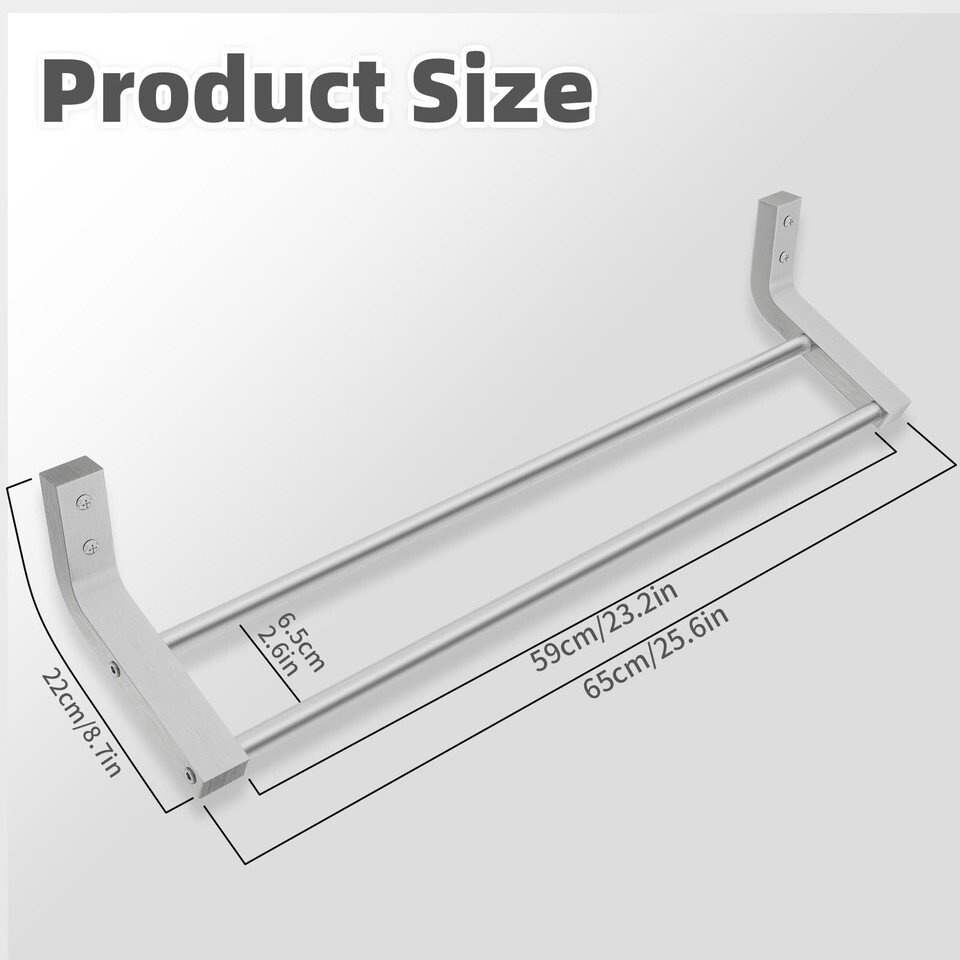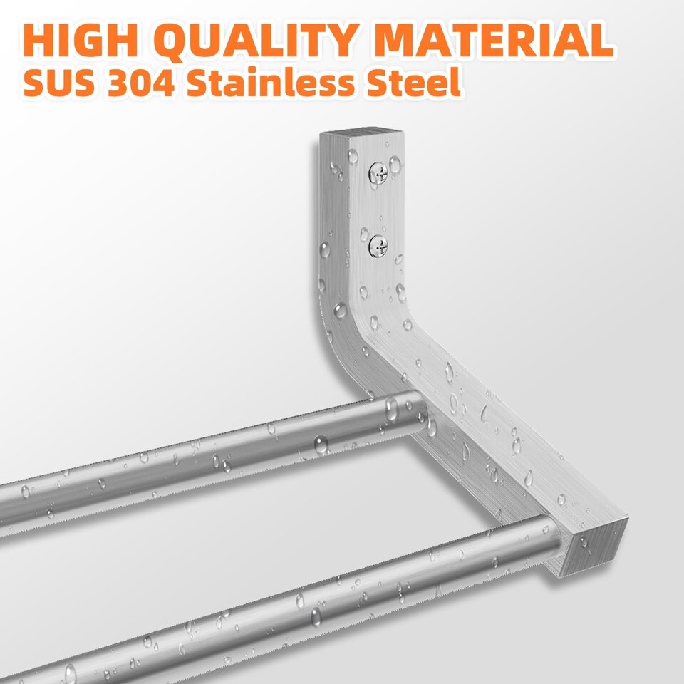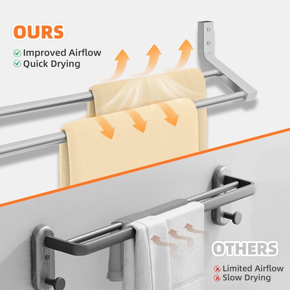 Our double towel bar is designed for maximum efficiency and durability. With its innovative structure and high-quality materials, the towel bars for bathroom wall offers unparalleled performance. Features of the towel bar: Enhanced Ventilation and Space Utilization The dual-layer design ensures ample hanging space and excellent air circulation, keeping your towels dry. The separate tiers allow optimal ventilation for each towel. Efficient Towel Arrangement With a 2.6-inch gap between layers, you can hang more towels without squeezing them together. This increases usable area and ensures proper drying and fresh air exposure for each towel. Durable and Stable Construction Constructed with precise screw assembly, this bathroom towel bar offers enhanced stability and durability. Its strong load-bearing capacity guarantees no breakage or loosening over time. Crafted from premium SUS304 stainless steel, renowned for its high hardness, excellent corrosion resistance, and superior rust prevention. The heavy-duty thickened frame design ensures stability under heavy loads without deformation. The specially treated surface is smooth and resistant to aging, fading, and cracking. Our double towel bar combines innovative design, spacious separation, and robust construction to provide a reliable and efficient solution for your towel drying needs. Easy to install with our complete kit and detailed instructions, you can have your new towel bar set up in minutesno professionals needed!