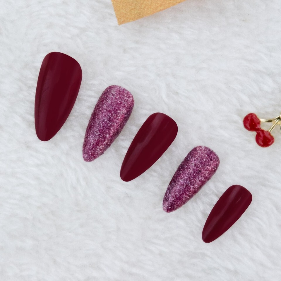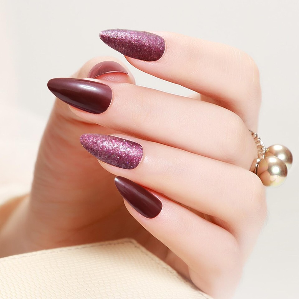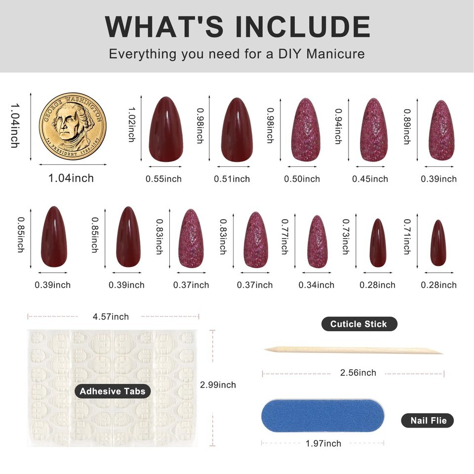 Yersunsy 24Pcs Almond Long Press On Nails Glitter Bling Wine Red