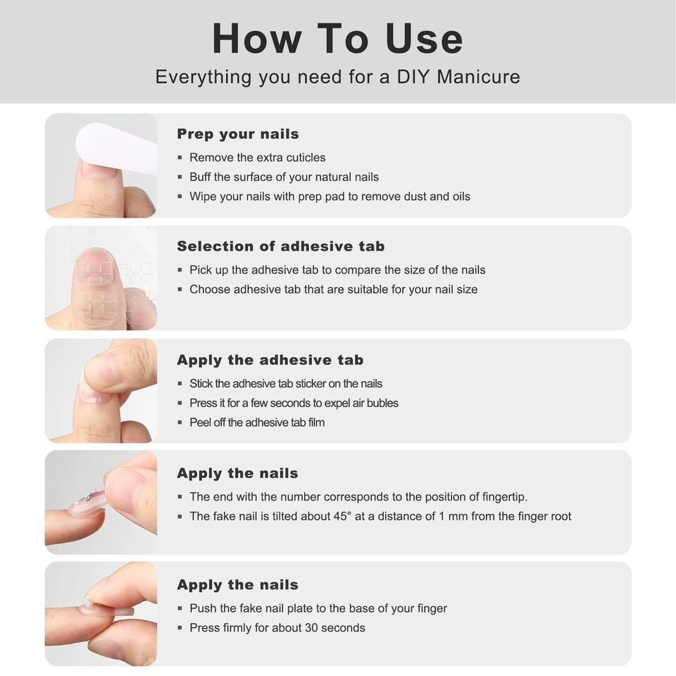 Easy to ApplyOur press on nails are easy to apply and remove. They come in a variety of sizes to fit different fingers, so you can choose the right size for each finger. And then you use the adhesive tabs to stick them on your nails. It will last for about 1-7 days with proper care.