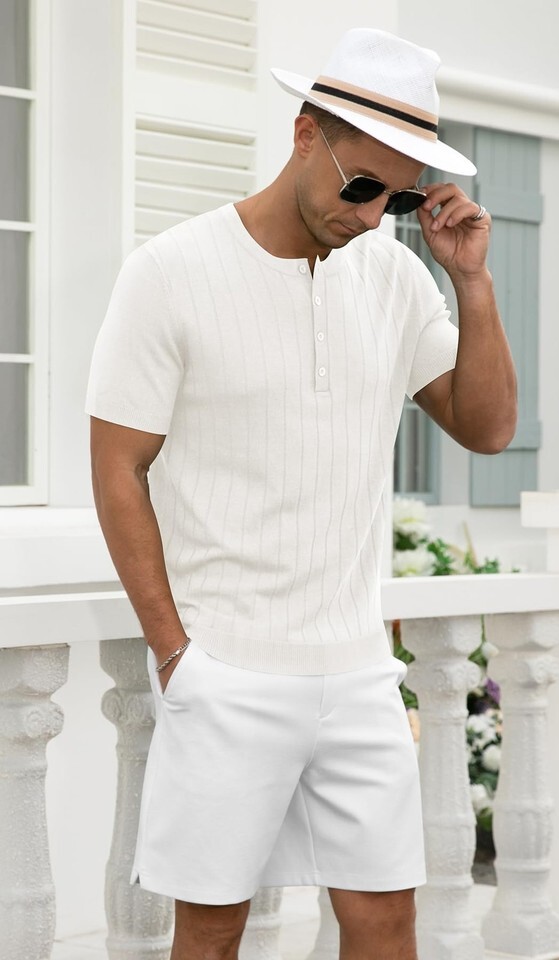 Kniting henley shirt with casual shorts, slacks and jeans, for a casual fashion daily look, or match with sports shorts for a workout look. Versatile menswear items, must-haves in your wardrobe.
