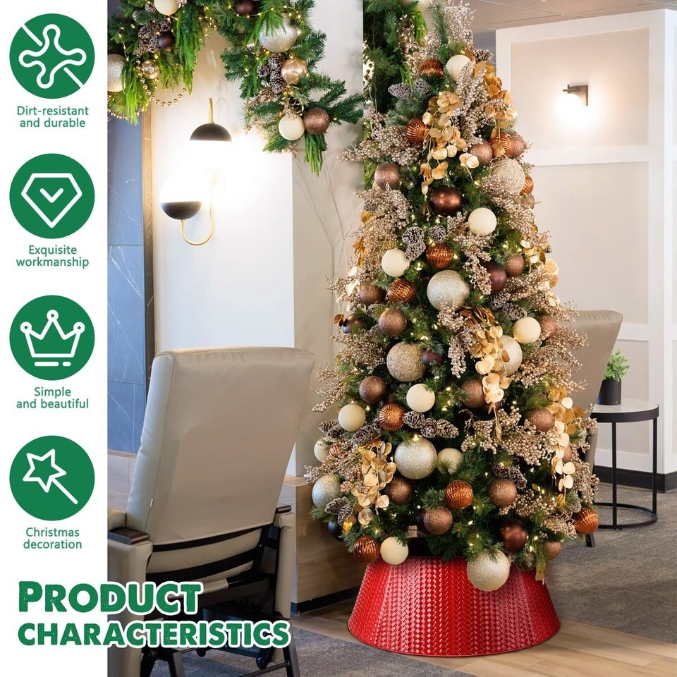 Classic Christmas Decor: This metal tree collar feature with shiny and sophisticated appearance, and the metal tree ring will cover the trunk and the tree stand of your Christmas tree, our Christmas tree collars offer a new fashion style to your holiday decoration. And the elegant handmade Christmas tree collars also as a great gift option to your family and friends