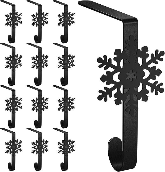 Gisafai 12 Pcs Metal Snowflake Christmas Stocking Holders Black Mantle Hooks