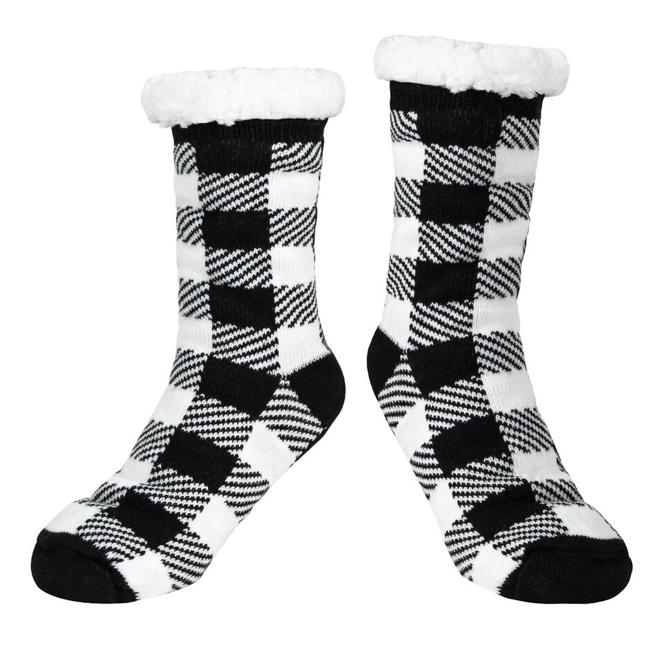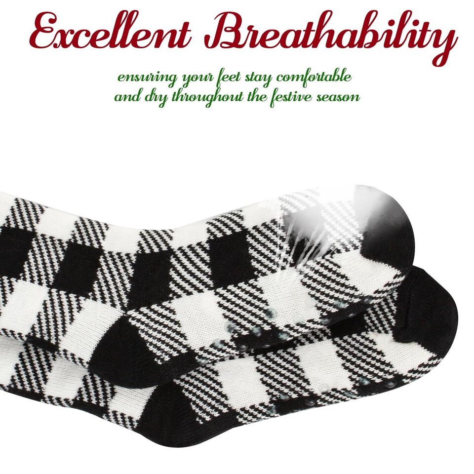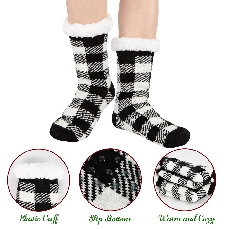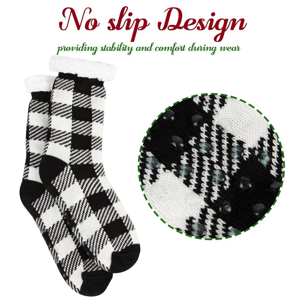 Christmas Womens Slipper Socks Fuzzy Fluffy Cabin Cozy Winter stocking Thick Warm Comfy Fleece Soft Grips, these fleece-lined slipper socks fit womens US sizes; the elastic construction provides a snug and comfortable fit for all-day wear Warm and Fluffy Comfort: Made with soft, cloud-like fluffy fabric, these socks keep your feet and toes warm on chilly mornings; the plush fleece lining adds extra coziness for maximum comfort Secure Non-Slip Grip: Designed with silicon rubber grips on the soles, these socks help prevent slips and falls on smooth floors; ideal for women or seniors, combining safety with a stylish look that complements any outfit Perfect for Relaxation and Sleep: Enjoy the sensation of walking on a soft padded cloud with these fluffy socks; they keep your feet toasty whether youre lounging at home or sleeping soundly; each pack includes one pair of slipper socks Thoughtful Gift Idea: These winter socks are a fantastic gift for home use; perfect for girlfriends, daughters, wives, or as thoughtful presents for birthdays or the holiday season, ensuring warmth and comfort for women and girls