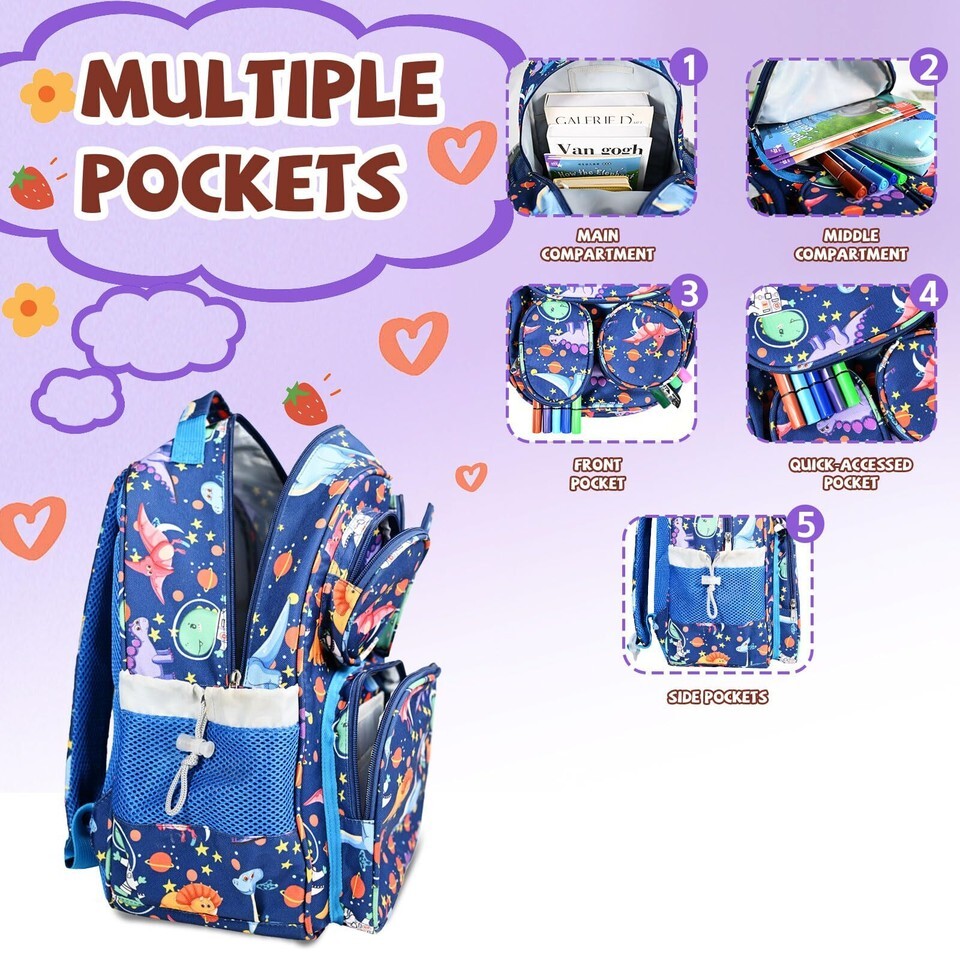 Spacious StorageThe roomy main compartment can hold laptops, tablets, 3-ring binders, notebooks, and more. Additionally, there are three zippered outer pockets - two perfect for smaller items like pens, erasers, or snacks for preschool, kindergarten, and elementary school, and one large pocket suitable for art brush, workbooks, pens, and the like. The side mesh pockets can accommodate 2 large water bottles, umbrellas, or a set of utensils for convenient dining on the go.