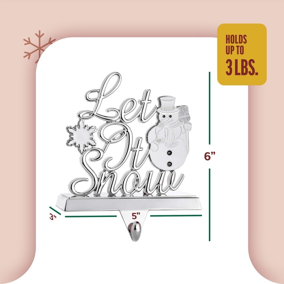 UNIVERSAL THEME: This mantle stocking hook has a wintry snowflake and snowman with the cutout "Let It Snow" holiday bows and glass balls. The universal theme makes this suitable for little kids, big kids, and families of different faiths.