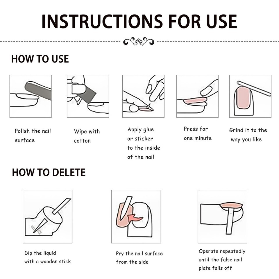 Tips for Using: You can use the nail glue stickers we give away (use nail glue stickers, fake nails can be reused), but nail glue stickers are not as good as liquid glue, if you want more lasting, please use nail glue, the effect can last for 1 week.