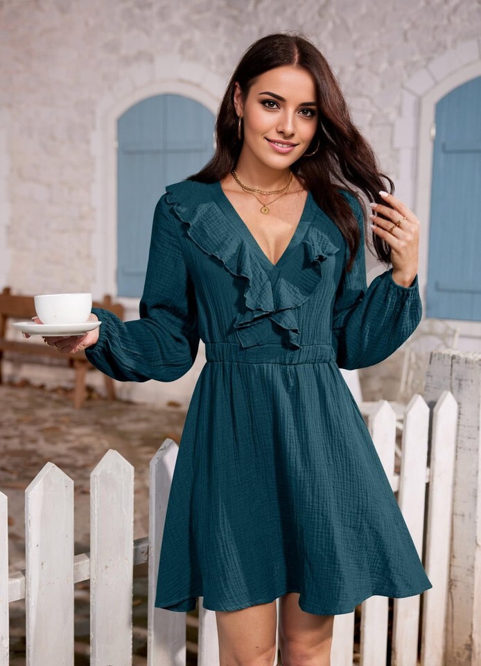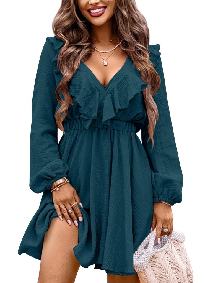 Elegant and Versatile - This tunic dress features a deep V-neck and puff sleeves that add an elegant touch to the textured fabric. The high waist and ruffle detailing give it a skater dress vibe.