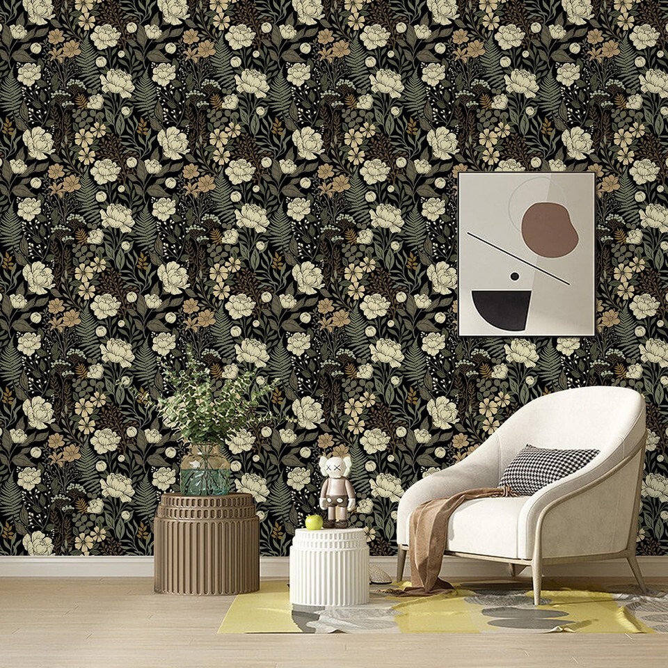 Exquisite Patternl Design Floral wallpaper leaves flowers, natural lifelike, wallpaper with black as the background color, by blooming white flowers and leaf constitute a symbol of vitality, make people's eyes bright