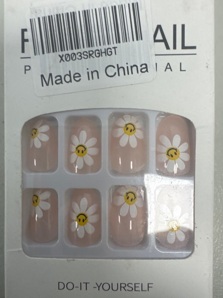 Medium Press On Nails Short Almond Floral Nude Pink Smiling Daisy 24 Pcs