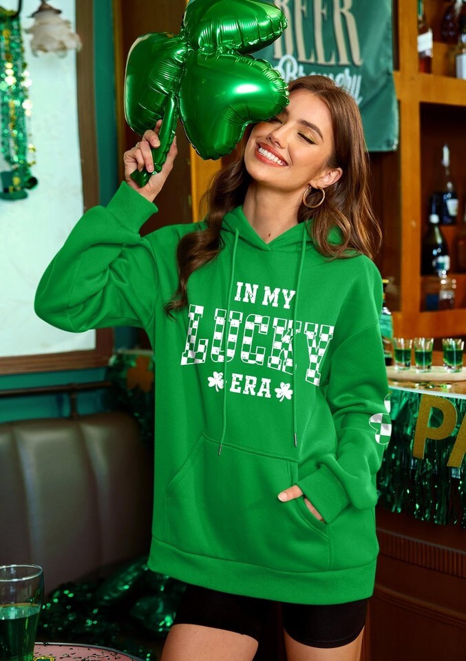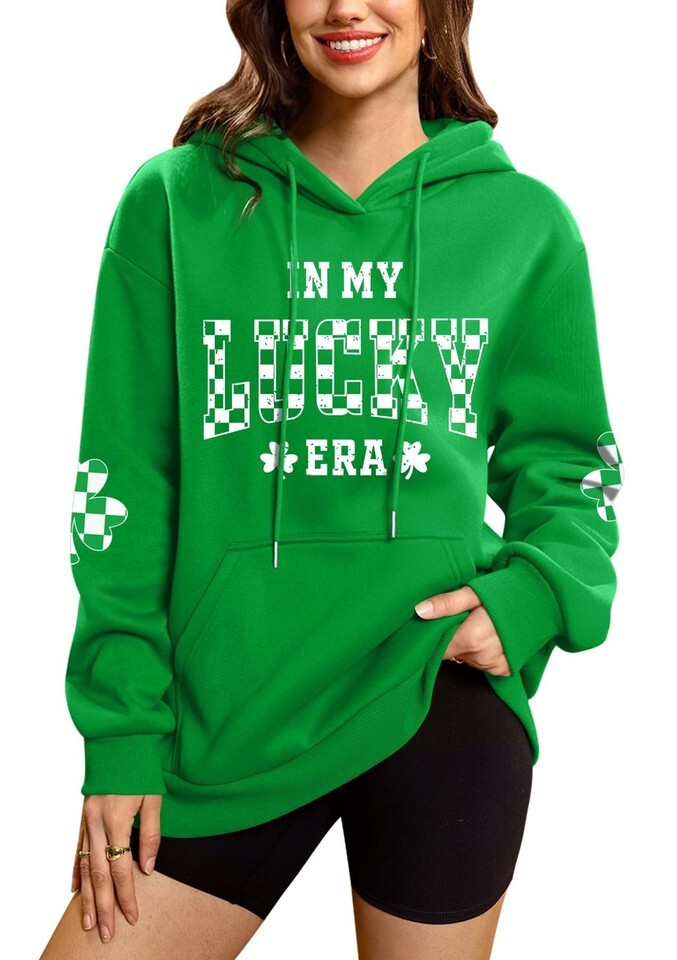 Lucky Hooded Sweatshirt for Women - Festive shamrock patterns; most variants feature 3D prints, with some offering towel embroidery or sequins for extra charm; long sleeves, cozy hood, relaxed fit