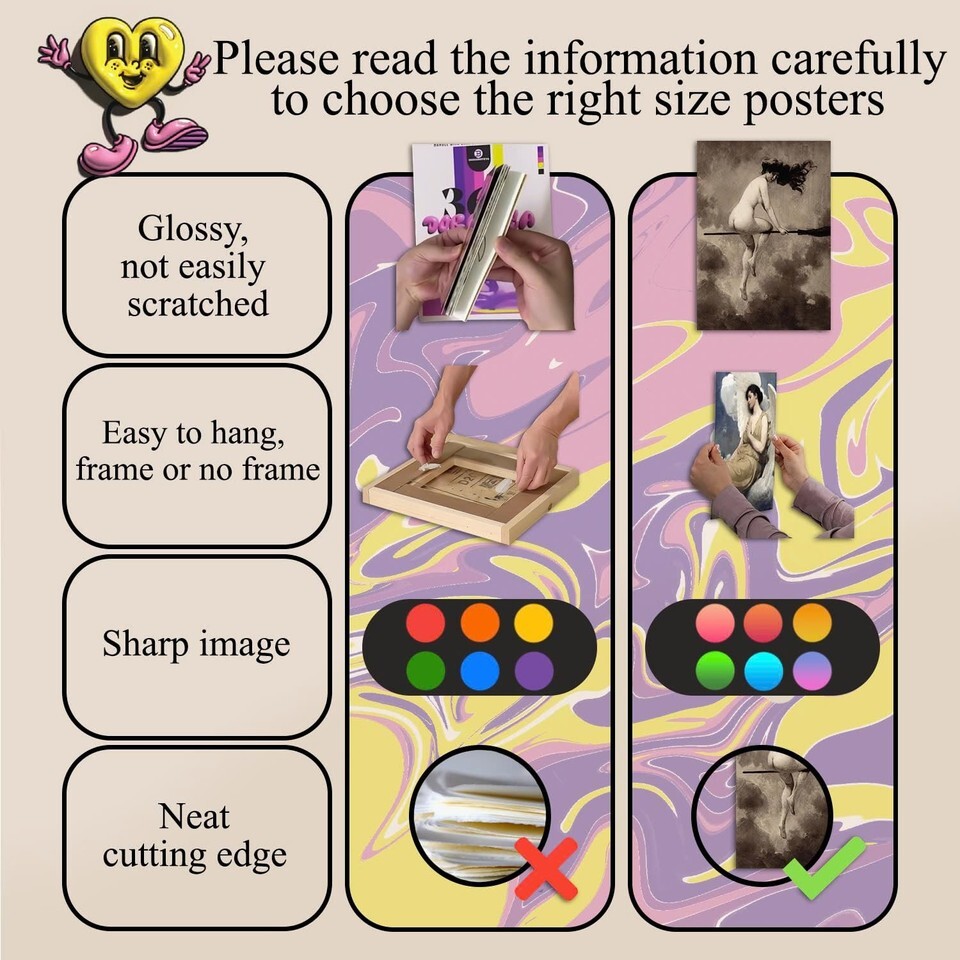 Our set of 40pcs wall art come in standard sizes: 40pcs 4"x6" making them easy to display. Transform your walls into an art gallery with high-quality prints and posters. Infuse your space with a playful vibe by combining playboy room decor with aesthetic bedroom decor that reflects your unique style.