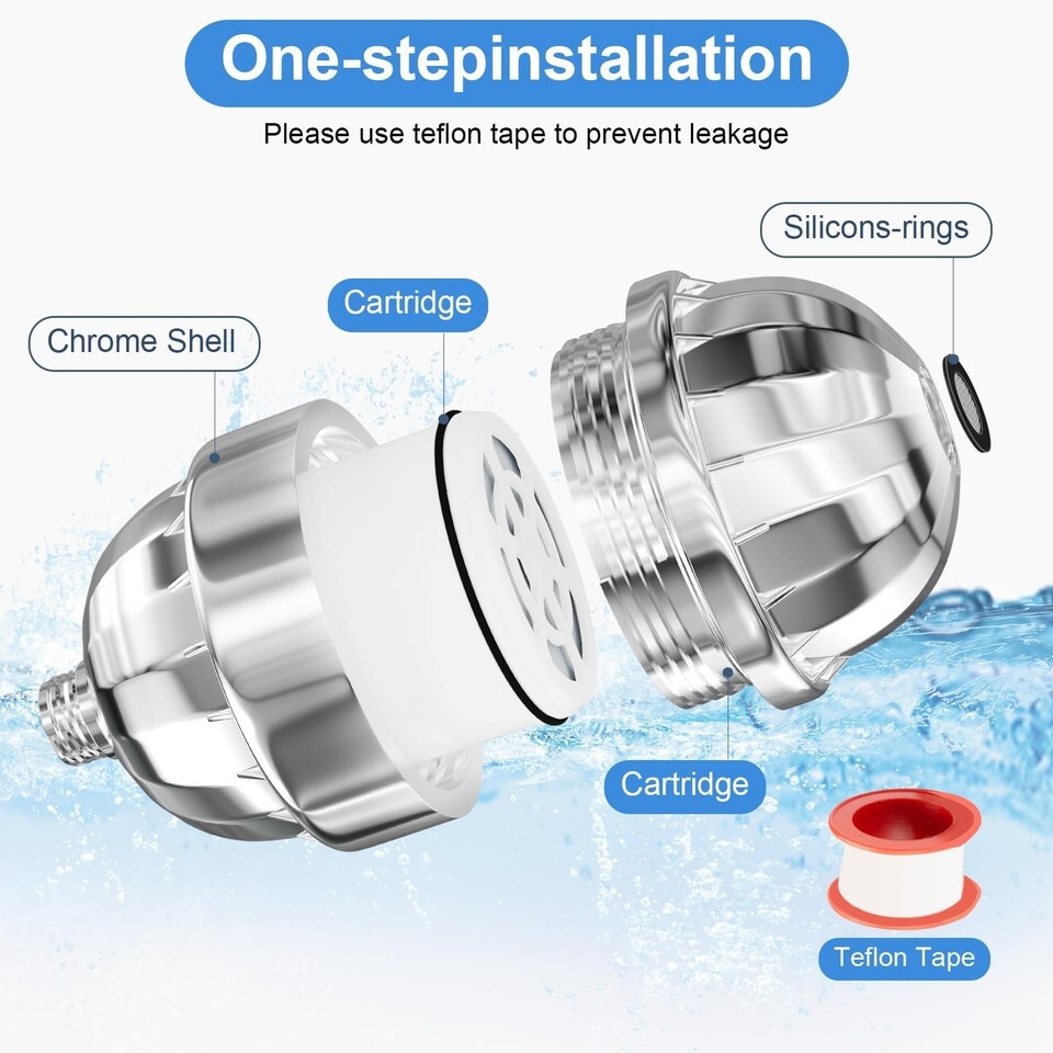 Universal and Easy to Install: Our universal shower head filter fits all types, from fixed to rain, handheld, and combo styles. Flush 5-10 minutes before first use to remove carbon dust.Open housing, replace cartridge, add teflon tape, place gasket