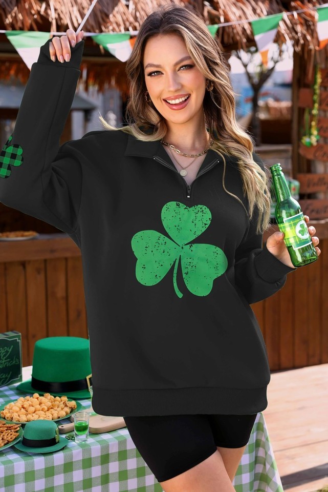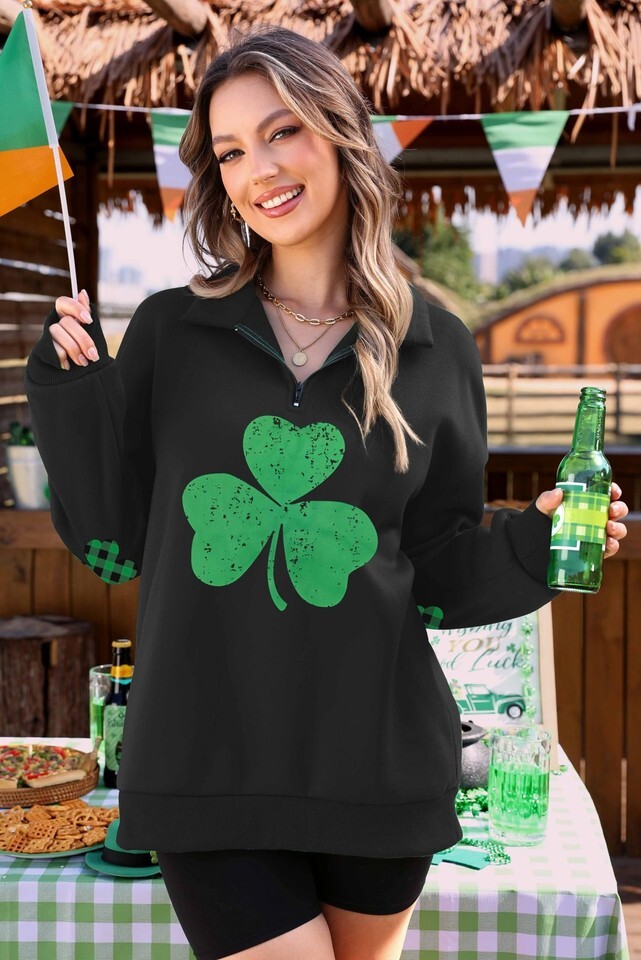 Lucky Quarter Zip Pullover for Women - Shamrock 3D prints throughout; some designs with subtle glitter accents for added sparkle; cozy collar, long sleeves, oversized fit for a relaxed, stylish look