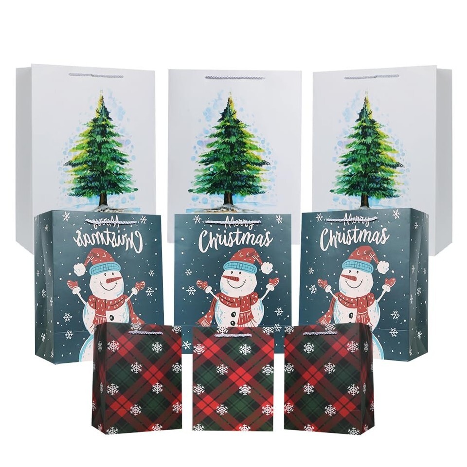The HSOMK Christmas Gift Bag Set is available in Large (L 12.5 x W 4.5 x H 16.5), Medium (L 10.2 x W 4.9 x H 12.2 ) and Small (L 7 x W 3.9 x H 9) 3 of each size, perfect as an office gift for coworkers or family members, with its charming Christmas-themed design that makes gift-giving a joyful experience.