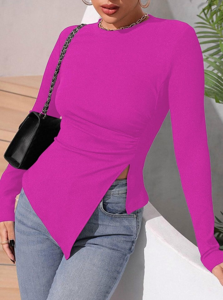 Remidoo Women's Rib Knit Long Sleeve Top Hot Pink Size L