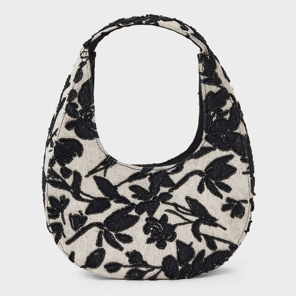 A New Day Mini Beaded Crescent Handbag Off-White Black Floral Pattern