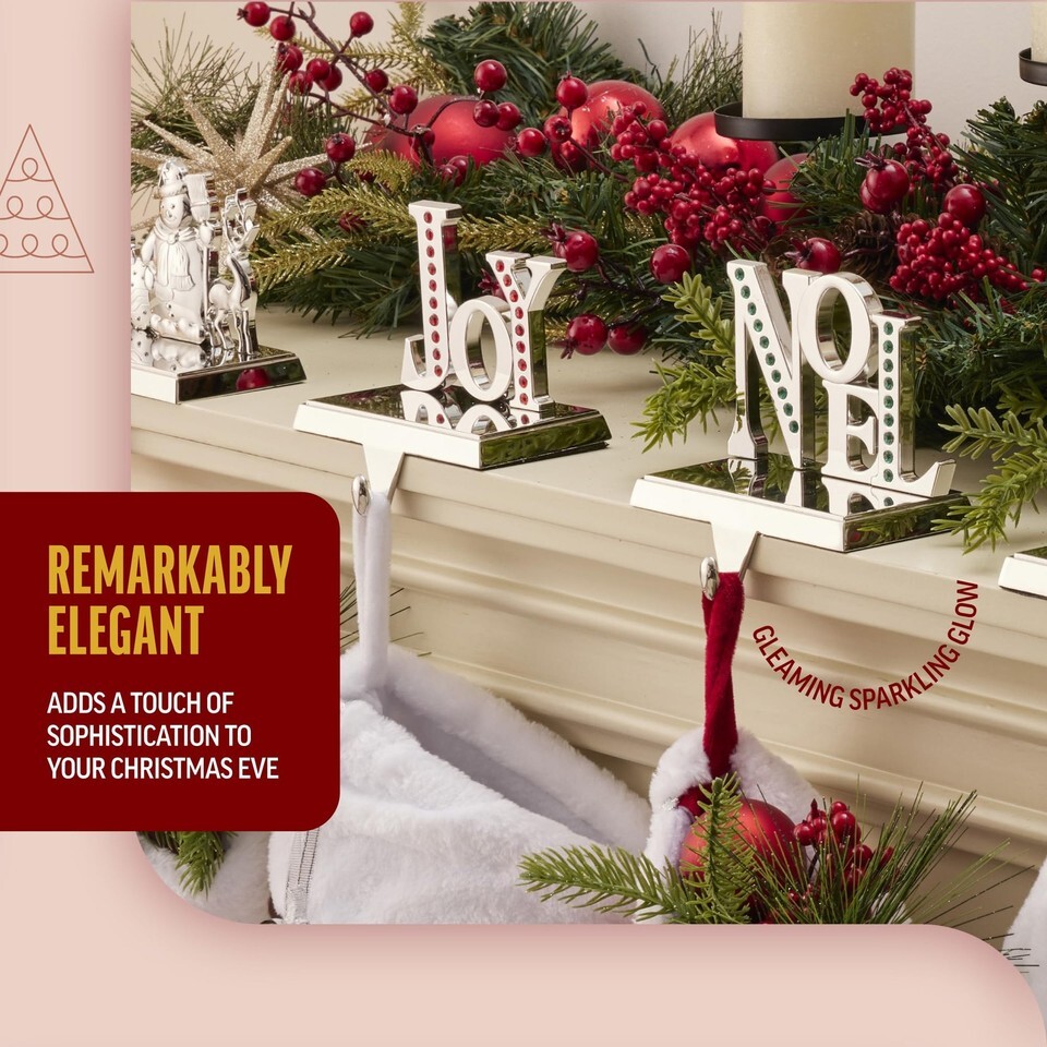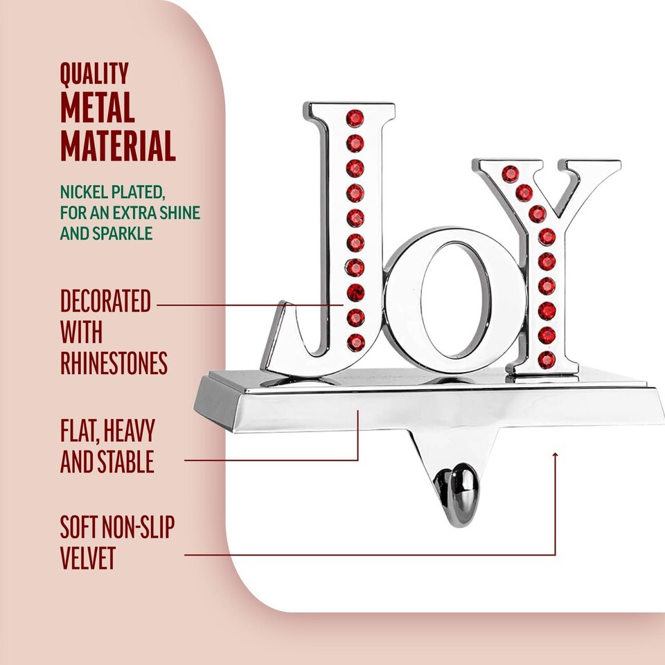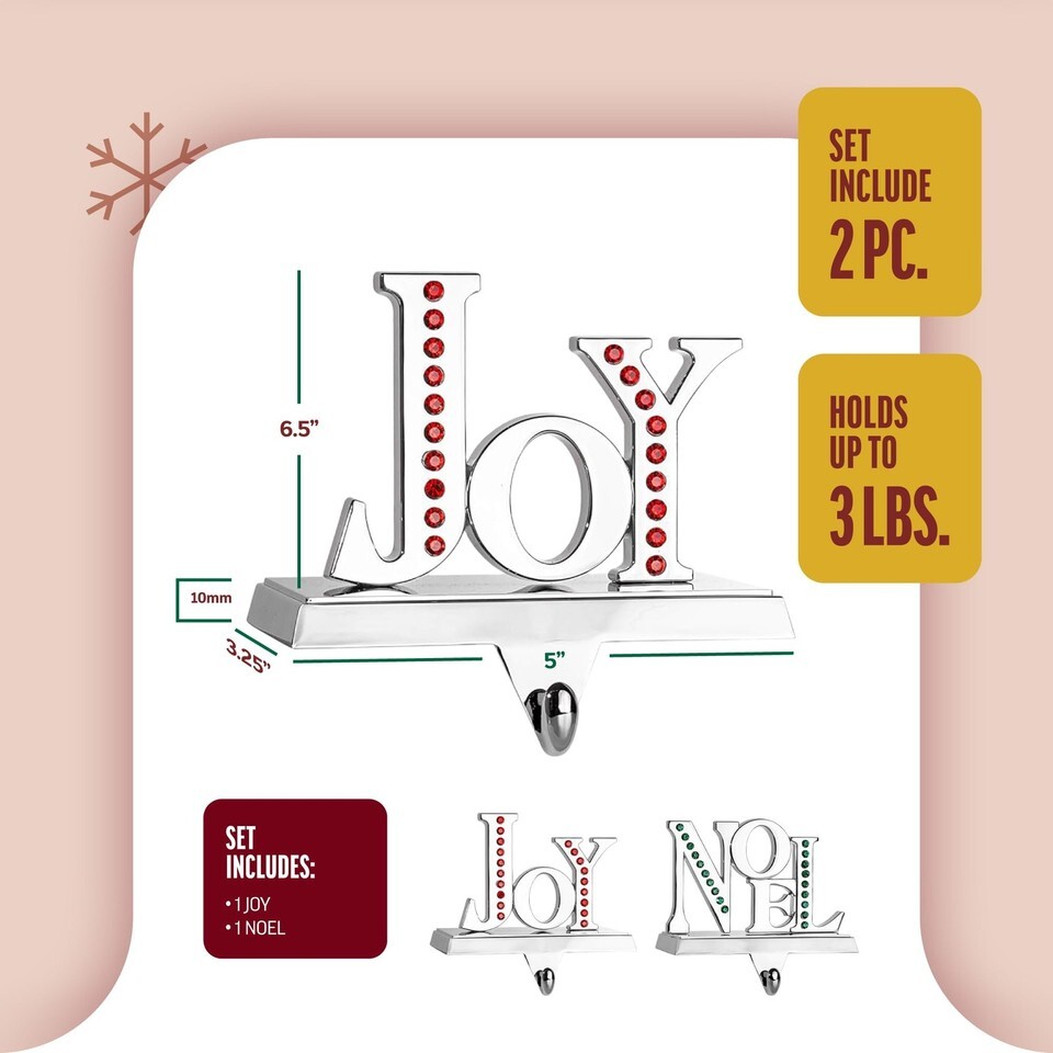 CHRISTMAS THEME: This mantle stocking hook set has festive red and green crystals. The crisp cutouts, Joy and Noel, make a memorable and exciting display for everyone awaiting Santa.