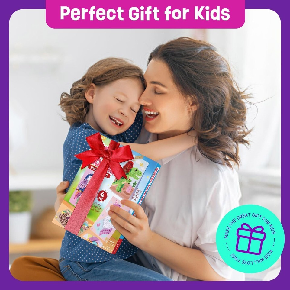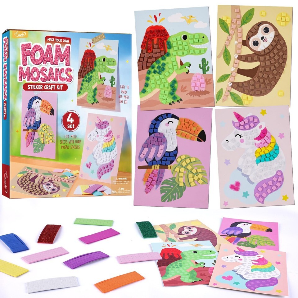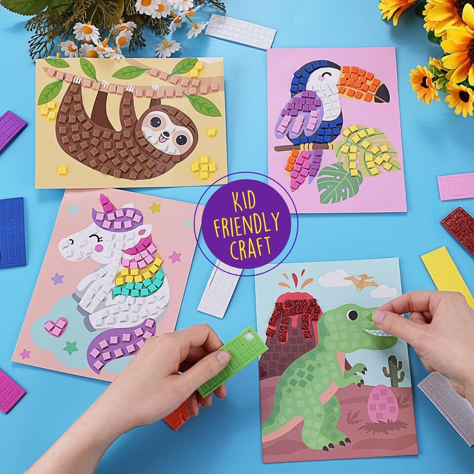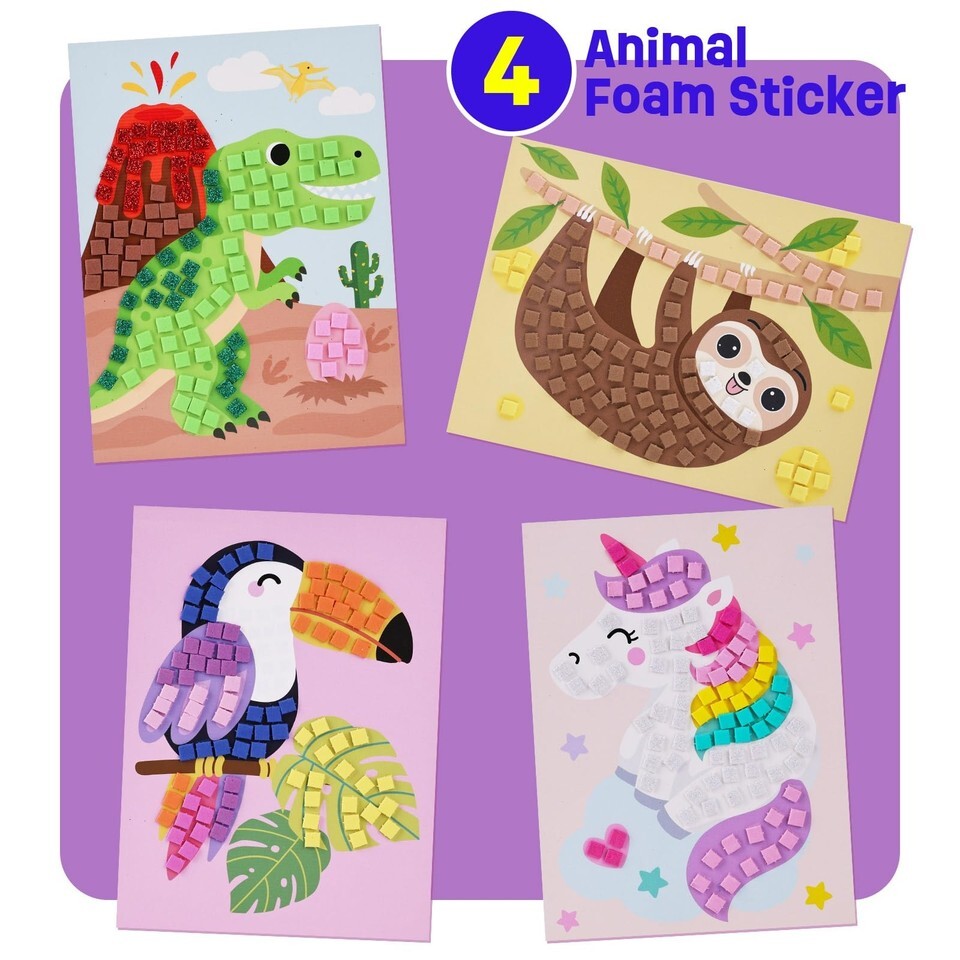 4 COMPLETE CRAFT KIT: Package comes with 29+Pcs to make 4 kinds different foam mosaic stickers, which could create Unicorns, dinosaurs, Woodpecker, Sloth types. More options, more creativity and fun. Each separate packages also ensure crafting convenience, making it perfect for gifting or distributing among kids aged 3 plus.