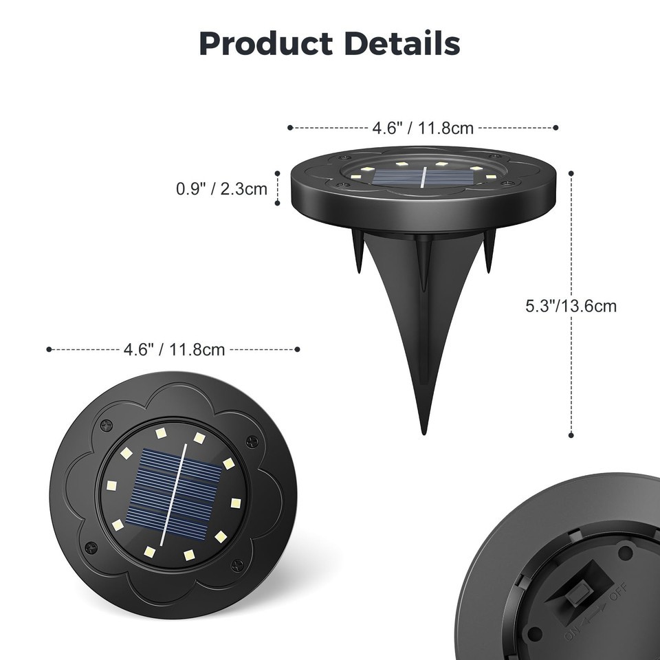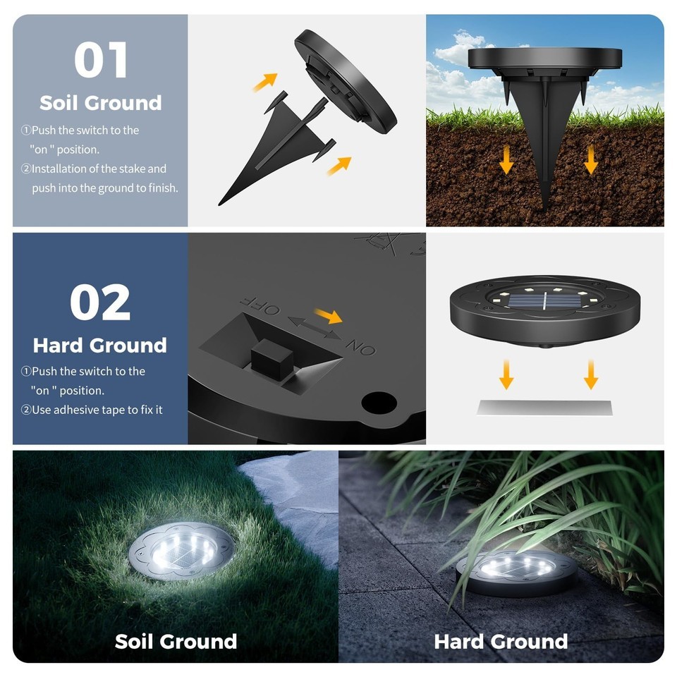 Dual and Easy to Installation Options: 1: Each solar garden lights come with two ground stakes which have high corrosion resistance. Turn on the switch under the cap and You just need to push the spikes into the grass, soil, stone or bricks with the spikes. 2: you can use adhesive pads for mounting on solid surfaces. Dont worry about the lawn mower and stroller destroying the lights, it can withstand a weight of up to 200kg.