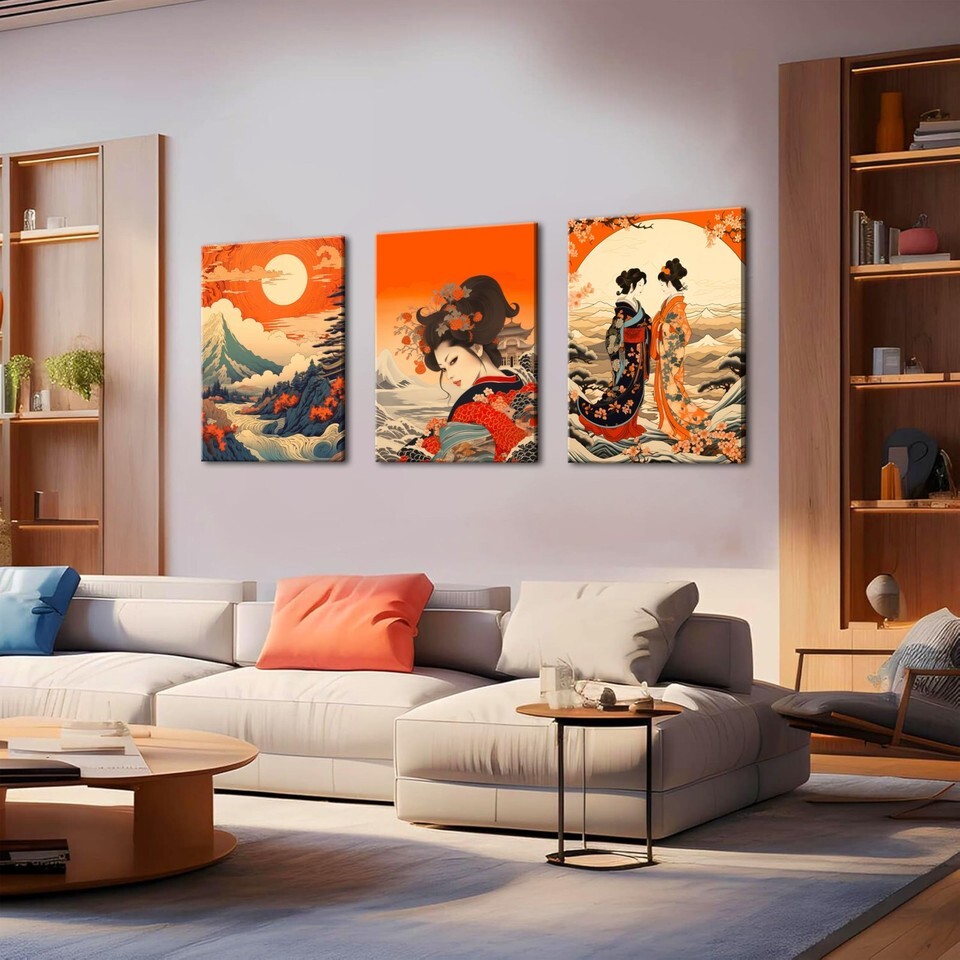 Japanese Wall Art Elevate your home with our exquisite Framed Japanese Wall Art Set. Featuring three stunning canvases, this collection brings the beauty and elegance of Japanese aesthetics into your living spaces. The set includes a striking giant wave, a serene cherry blossom, and a graceful Geisha woman, each meticulously crafted to capture the essence of traditional Japanese art. Perfect for adding a touch of tranquility and cultural richness to any room, whether it's your living room, bedroom, or office. Japanese Decor Transform your space into a peaceful retreat with our Japanese-inspired decor. The framed canvas prints in this collection showcase iconic elements of Japanese culture, from the powerful imagery of the giant wave to the delicate beauty of cherry blossoms. These pieces are ideal for those looking to infuse their home with the calming and sophisticated ambiance that Japanese decor is known for, making them a perfect fit for both modern and traditional interiors. Asian Wall Art Our Asian wall art collection is designed to bring the timeless beauty of the East into your home. The framed canvases in this set are not only visually stunning but also deeply evocative of the rich artistic traditions of Japan. Whether youre decorating a contemporary space or a more classic setting, these prints offer a versatile solution that enhances any decor style. The blend of bold and delicate elements in these artworks creates a harmonious balance that will captivate and inspire. Cherry Blossom Wall Art Celebrate the fleeting beauty of cherry blossoms with our exquisite wall art. The cherry blossom canvas in this set captures the ethereal nature of these beloved flowers, symbolizing the transient beauty of life. This piece is perfect for adding a soft, romantic touch to your decor, making it a wonderful addition to bedrooms, living rooms, or any space where you seek to create a peaceful, reflective atmosphere. Japanese Room Decor Complete your rooms transformation with our Japanese room decor set. These framed canvas prints are not just art; they are a statement of style and culture. Whether you're creating a serene bedroom retreat, a sophisticated living room, or an inspiring workspace, this set provides the perfect finishing touch. The timeless appeal of Japanese aesthetics combined with the high-quality craftsmanship of these prints ensures they will be a cherished part of your home decor for years to come.