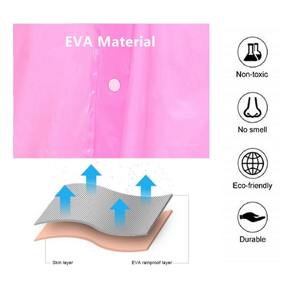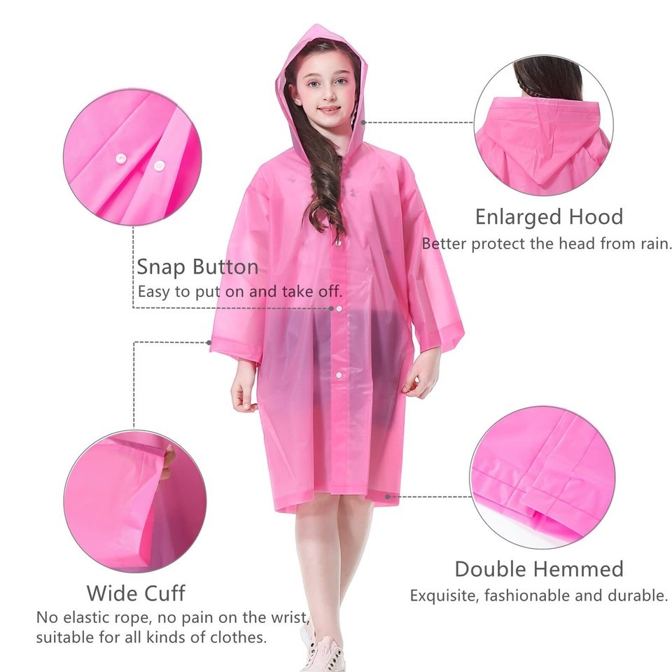 It is inconvient for children to carry an umbrella, the best way is preparing an emergency raincoat for them. The rain ponchos are lightweight, portable, reusable and cheap, don't worry to demage it, it is not only waterproof and windproof but also a fashional coat. It is very practical, the kids can wear it to go to school, play in the snow, perfect for disney world trip, school trip, theme park, camping, fishing, hiking and other outsoor activities. So why wait another second? Just take one for your kids! Why choose our rain coats? High Quality Material Made of high grade EVA material, environment-friendly, non-toxic, no smell, thick but lightweight, durable, tear resistant, comfortable, reusable and portable. Exquisite Design Drawstring hood reinforces waterproof around head and neck. Long rain jacket with long sleeves. Double layers hemmed wide cuffs and hem, well-made and fashionable. The snap button design are secure, handy and convenient to put on and off. One Size Fits Most Length of raincoat: 43.3 in Lenght of sleeves: 26.2 in Chest: 43.2 in Fits for 90150cm/2'11''4'11' boys and girls. Specifications: Material: EVA Thickness: 0.15mm Package Size: 7.87x5.9x0.67 in Weight: 95g/3.35 oz Season: Spring, Summer, Fall, Winter Suitable for: Teen boys, girls, youth, toddlers Package includes: 2 x Kids Rain Ponchos