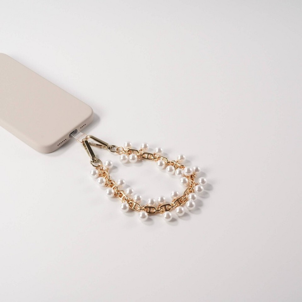 Elevate your style with this elegant GEMS Phone Wristlet, featuring a shiny golden chain with beautiful faux pearls. It's the perfect length for a secure yet comfortable fit around your wrist. The durable clasps allow for quick and secure attachment to most bags and purses, adding instant versatility to your favorite accessories. The included universal phone connector card is designed for easy and secure attachment to any phone case. Combining chic design with practical functionality, this crossbody chain is the perfect blend of fashion and convenience.