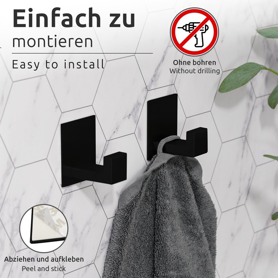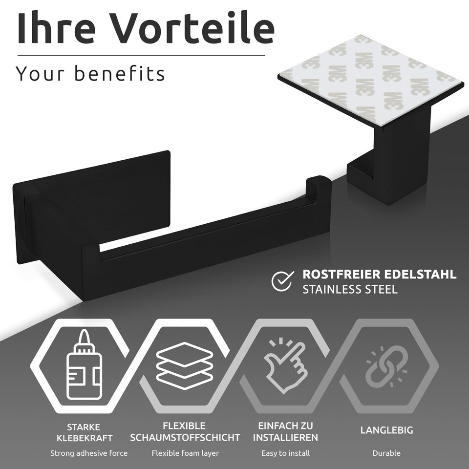ECENCE Bathroom Hardware Set 1 Toilet Roll Holder + 2x Towel Hooks self-adhesive without drilling black Stainless steel 304 Towel bar Set Bathroom Accessories- Our set, consisting of 2 towel hooks and a toilet paper holder, impresses with its simple and high-quality design. Made of rust-free stainless steel 304, these accessories are perfect for bathrooms and wet areas as they do not rust. The self-adhesive technology allows for easy, drill-free installation while ensuring a firm and stable attachment to the wall. The necessary mounting material is included.These hooks have versatile uses- In the hallway as a key rack or for hanging jackets and bags. They are also practical in the kitchen, for example, for storing kitchen towels. The toilet paper holder fits harmoniously in any bathroom, toilet, or guest bathroom and is even perfect for use as a workshop paper holder. This provides versatile solutions for your needs without unnecessary drilling into your tiles.Advantages Features- Sturdy wall hooks and toilet paper holder made of rust-free stainless steel 304- High-quality angular design- Stable installation thanks to 3M adhesive pad- Easy installation: Mounting material is included- Durable and resilient- Universal applicationWith this high-quality bathroom accessory, you can stylishly upgrade your bathroom and benefit from practical functionality.Scope of supply- Bathroom set 1x self-adhesive toilet paper holder + 2x towel hooks Black#