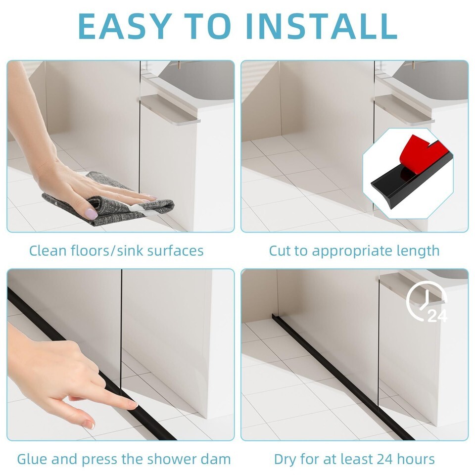Strong Self Adhesive Backing: Please clean the surface of the self adhesive strip before installation, cut shower dam to a suitable length, peel off the self-adhesive strip at the bottom and press it to the surface, you can use a hair dryer to heat it to strengthen the fixing and waterproof effect. After installation, let it sit for 24 hours before use