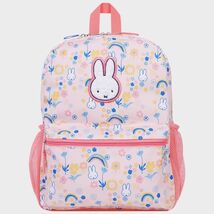 Introducing our Miffy backpack, designed to offer both functionality and charm for your everyday adventures. This backpack features a spacious main compartment, perfect for carrying books, toys, and other essentials. The front pocket provides easy access to smaller items and includes a larger Miffy character patch for added personality. The predominantly pink design is adorned with a delightful pattern of small Miffy characters, rainbows, and pastel-colored flowers, bringing a sense of joy and imagination. Inside, you'll find a bunny-shaped label with lines for writing personal information, ensuring your backpack is always identifiable. Pink mesh side pockets are ideal for holding water bottles or snacks, keeping them within reach. The backpack is equipped with comfortable pink straps that are adjustable to fit various sizes, ensuring a secure and ergonomic fit. Durable and practical, this backpack is perfect for school, playdates, and family outings, offering ample storage and convenience while showcasing a