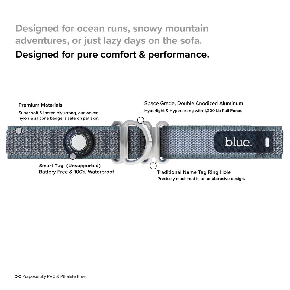 Premium Collar by Blue is the lightest, strongest and most comfortable collar in the world. Engineered with space grade aluminum polished hardware and double anodized for strength and scratch resistance. Buckle-free design. Proprietary woven nylon design is breathable, moisture wicking, and durable. Blue is 100% Recyclable, PVC-free, eco-friendly and sustainable. The unique size adjustment system provides your dog the perfect comfort-fit every time. Beautiful and elegantly designed by Blue. Sizes available for all dogs from Chihuahuas to Great Danes - Small, Medium and Large.