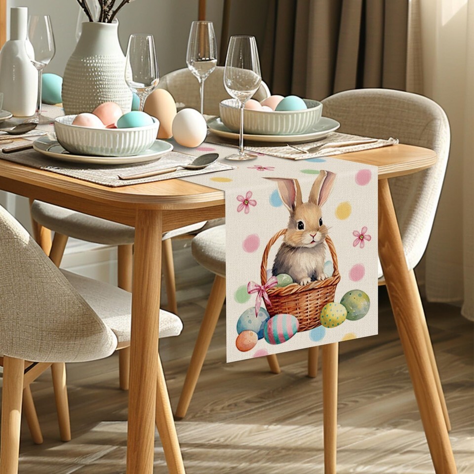 Easter Table Runner Bunny Eggs Basket Flowers Burlap Table Decoration Spring Holiday Home Party Kitchen Dining Table Supplies 13x72 Inch
