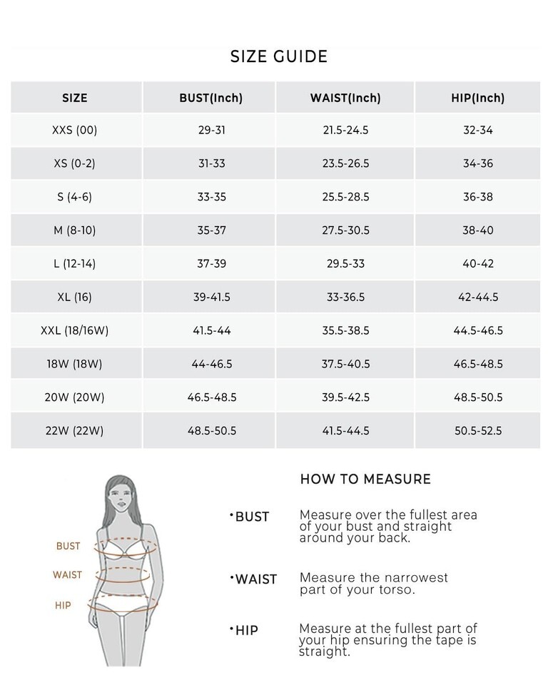 Multiple sizes for you to choose from: XXS(0-0), XS(US 0-2), S(US 4-6), M(US 8-10), L(US 12-14), XL(US 16), XXL(US 18), US 18W, US 20W, US 22W. Please refer to the detailed size measurement guide to choose the suitable size.