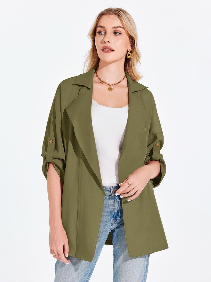 Features: Womens casual jackets could roll up with buttons as 3/4 sleeve or wear as normal long sleeve tops, oversized and lightweight style, solid color, open front, two utility side pockets, lapel neck jackets for women, flowy loose fit to suit for every bodyshape