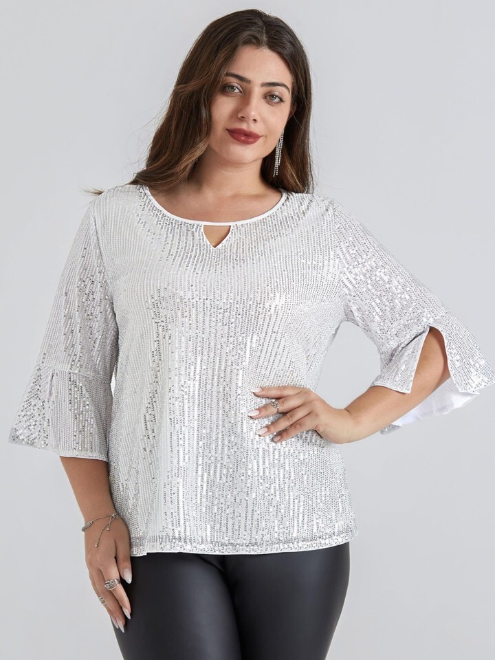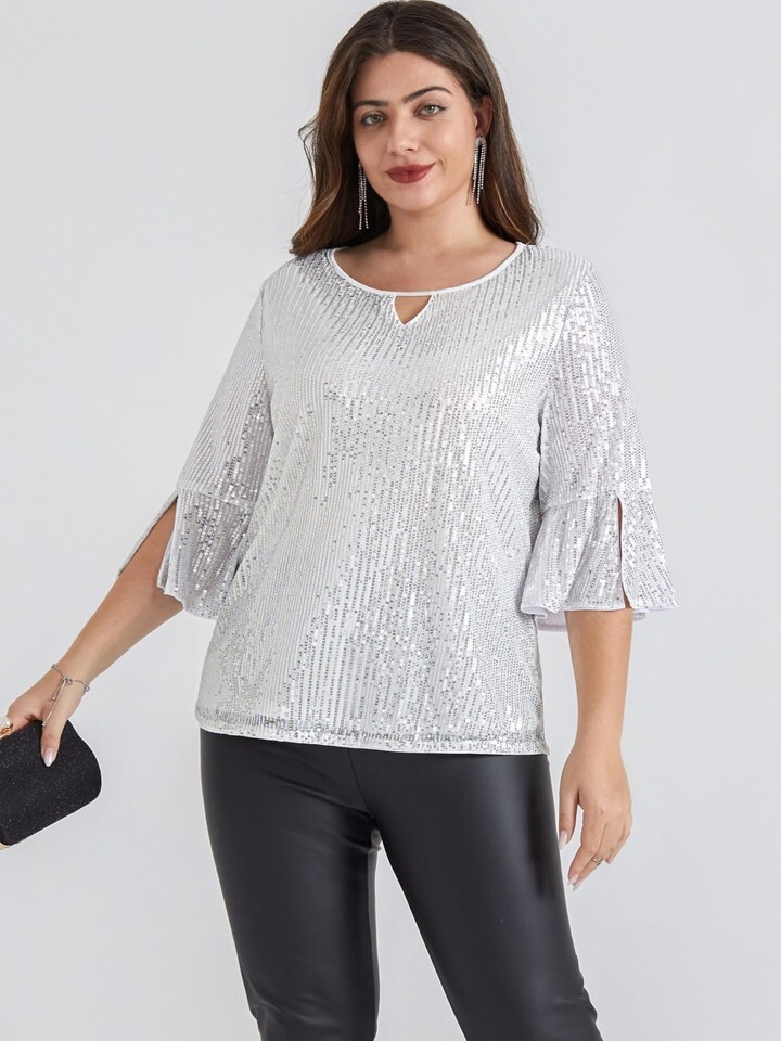 Fashion Design: Sequin Tops for Women features 3/4 Split sleeve bell sleeve, Cutout at the Crew neck makes you more sexy. The flowy and soft sheer mesh make it more sexy while you walk, show your perfect figure.