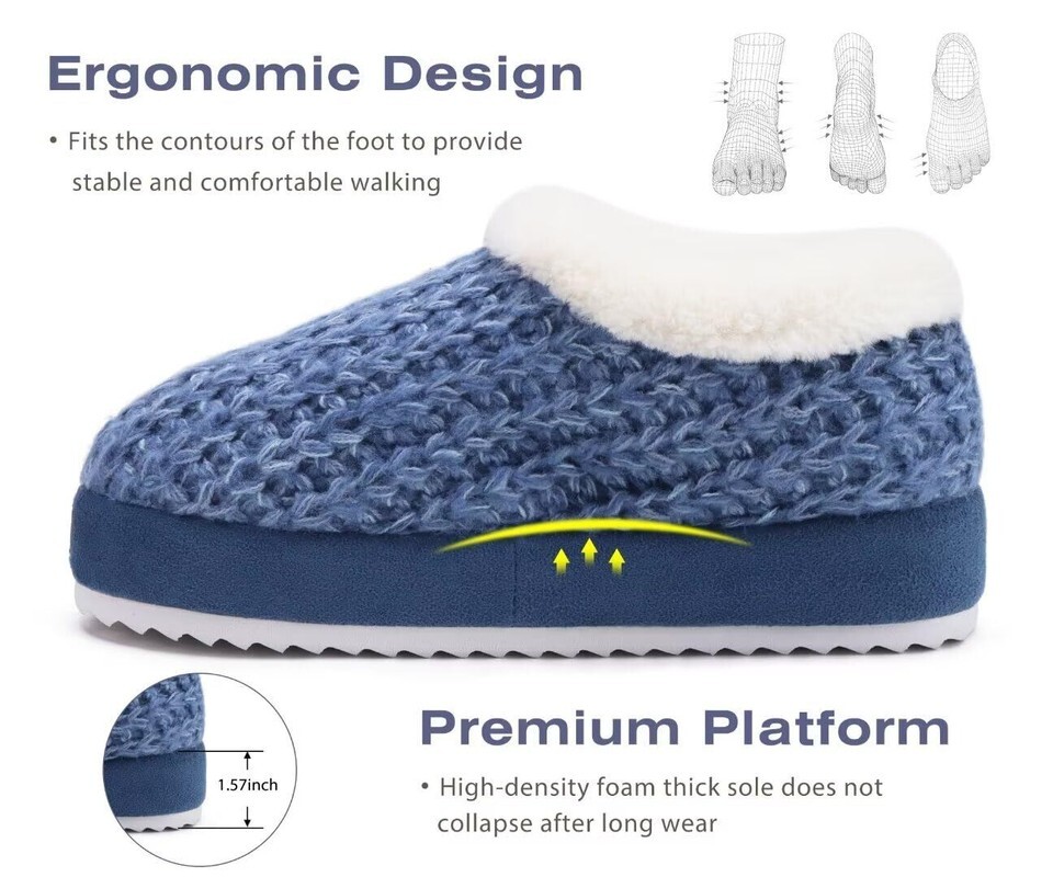 Materials : Knit Upper ; Faux Fur Lined ; Plush Collar ; Foam Thick Footbed ; Hard Rubber Sole
