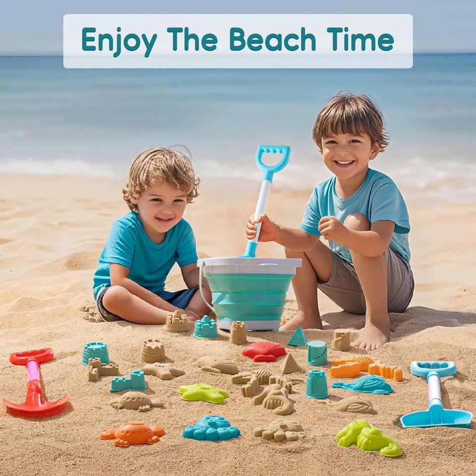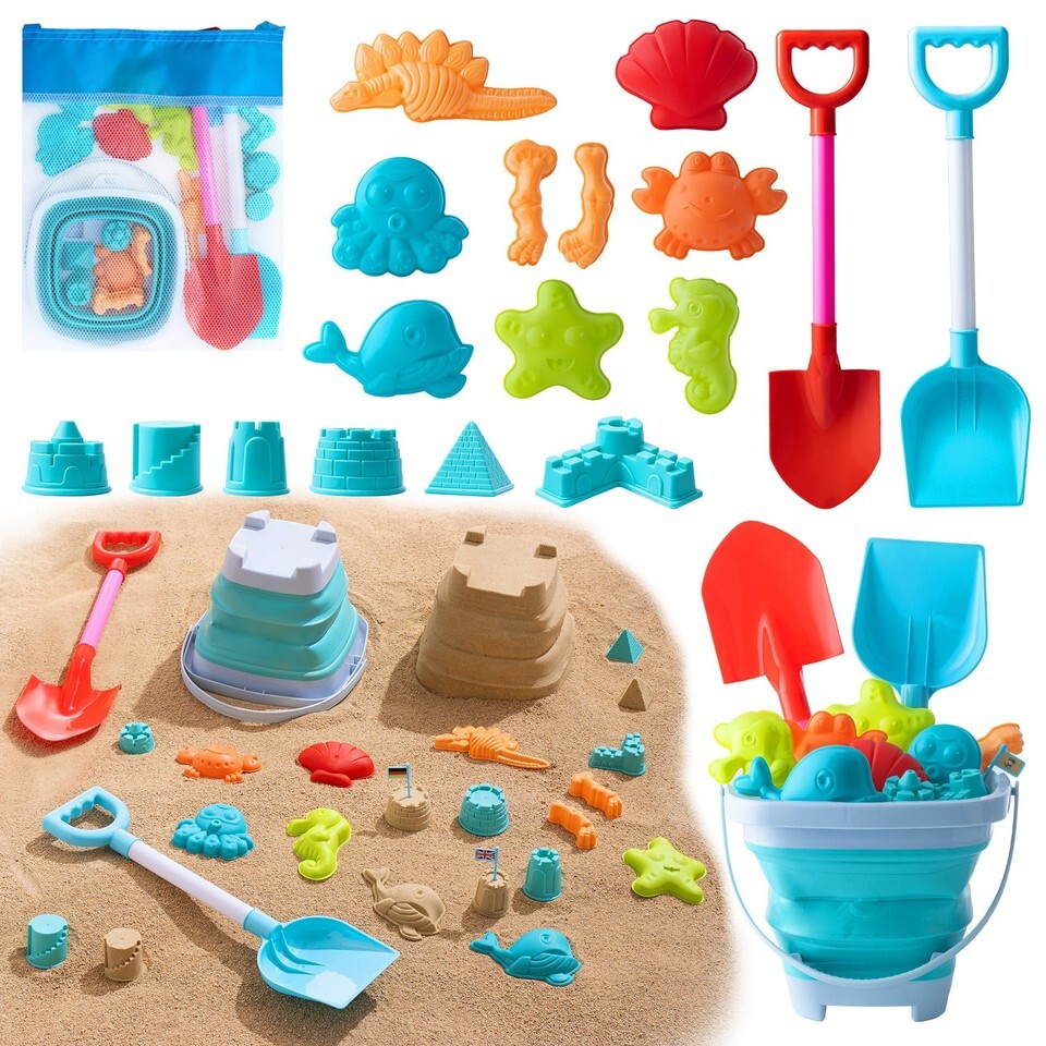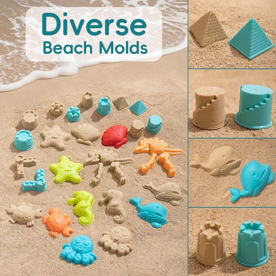 Super Value Sand Toys- Get ready for endless beach fun with our beach toys set! Our 43-set kids' beach toys include a collapsible beach bucket, 2*shovels, 6 Sandcastles, 24*flags, 6 stochastic animal molds, 3 dinosaur molds and a mesh beach bag. Perfect beach toys for toddlers and kids aged 3 4 5 6 7 8 9 10.