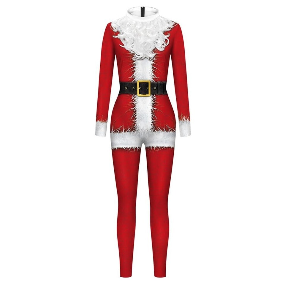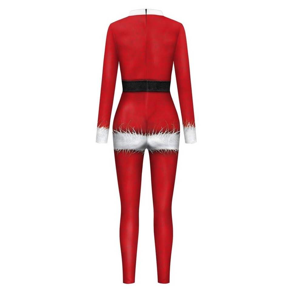 Features: Christmas themed jumpsuit and mask create a strong contrast