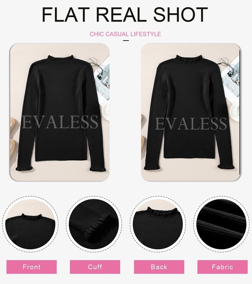 Elevate your fall wardrobe with EVALESS Fall Sweaters for Women 2024. Our Casual Ruffle Crewneck Long Sleeve Sweaters offer a perfect blend of style and comfort. Featuring a delicate ruffle design, ribbed knit construction, and a slim fit silhouette, these sweaters are versatile for any occasion. Stay cozy and chic in these base layer tops, perfect for layering or wearing on their own. Choose from a range of classic and trendy colors to suit your personal style. Experience fashion and comfort with EVALESS this fall.
