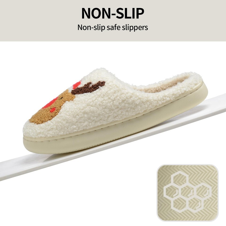 Festive Design: These cozy slippers feature an adorable reindeer design with antlers, a red nose, and embroidered details, perfect for getting into the Christmas spirit.