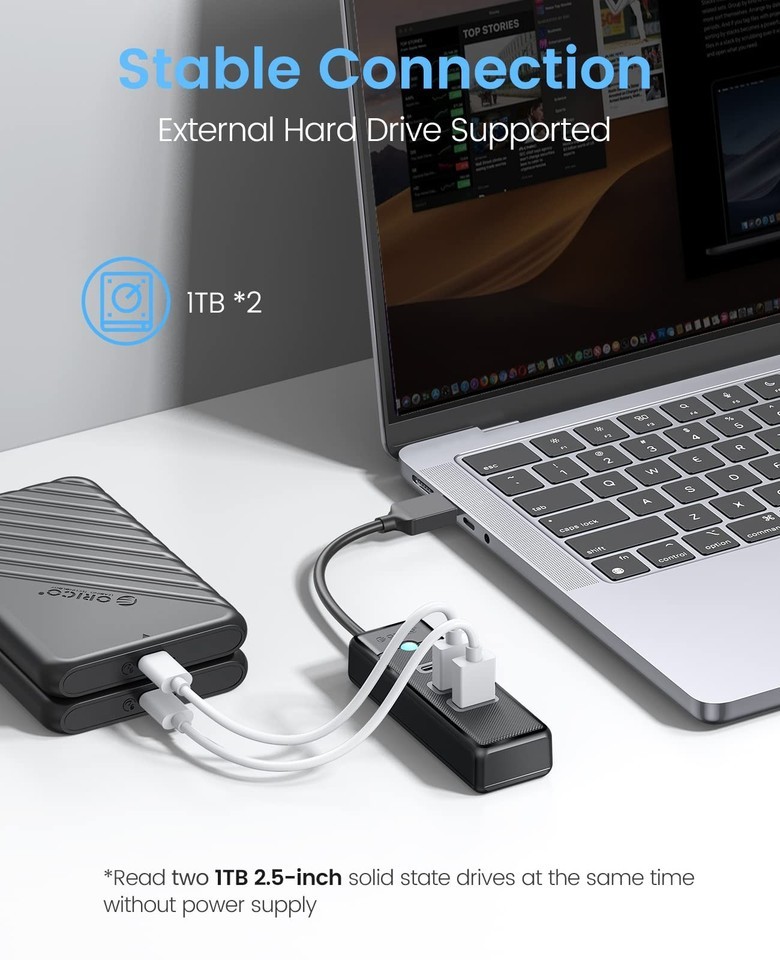 Extend USB 3.0 HubSplit one USB 3.0 port into four USB 3.0 ports, use this USB extender to easily connect USB-A devices to your laptop, such as USB flash drive, mouse, keyboard, speakers, games Controllers, hard drives and many other gadgets. (The hub is not powered and does not support charging. The ORICO USB 3.0 splitter is designed for data sync without charging, and we recommend that you do not use it to charge smartphones and other devices.)