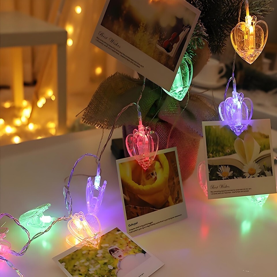 Starting from the mid-13th century, heart Symbols appear in works of art, representing the human heart and love. And ultimately became a widely accepted symbol of expressing love and emotions. Specially designed for heart-shaped symbols, the heart-shaped photo clip string light with 20LED clips bring a warm and romantic glow to any occasion. Perfect for Important, happy, and warm occasions like weddings, parties, Halloween Thanksgiving Christmas or home decor, heart-shaped photo clips can solve the problem of perfect display of photos and showcase a beautiful life and everlasting happiness. these heart-shaped lights add a touch of whimsy and charm. The heart shapes cast a soft, inviting illumination that creates a cozy ambiance.