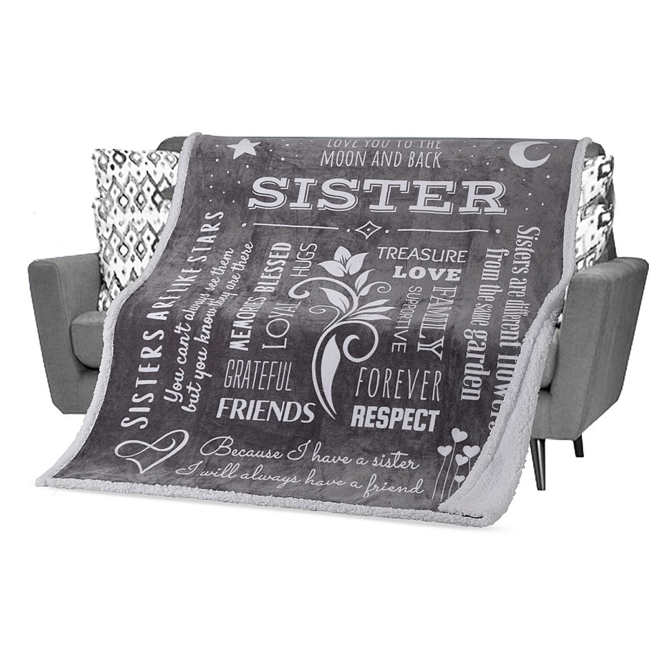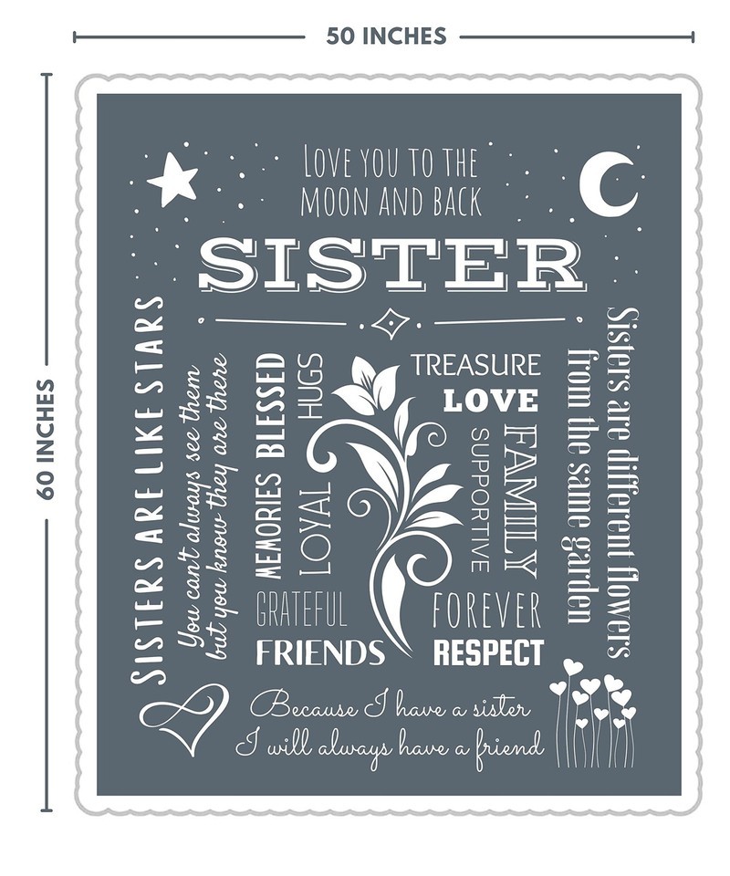 It could be for a twin sister gift, big sister gift for little girls or sister birthday gift from sister. Wrapped in ribbon and ready to give, the sister throw blanket is perfect for Christmas, Mothers Day, Birthdays or a significant birthday event such as a 30th, 40th, 50th, 60th, 70th or 80th. The throw blanket is filled with loving quotes that you and your sister will adore such as: "because I have a sister, I will always have a friend", "sisters are like stars", "love you to the moon and back" "sisters are different flowers from the same garden". As well as some other sentimental, loving, thoughtful and uplifting, inspirational thoughts such as family, supportive, memories, hugs, forever, respect, friends, grateful, treasure and loyal. It also would make a lovely present for the maid of honor, or sister of the bride at a wedding, or for an unbiological sister for college, graduation or hanukkah. It is a great way to express to say how much you are proud of your sister and show your appreciation. Filled with hearts and matching inspirational words on a plush fuzzy blanket. If you need gift ideas for teens or adults, for long distance gifts or for galentines, the sister blanket is a forever ever keepsake.