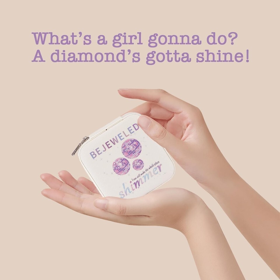 Our small jewelry storage box features the words 'bejeweled', complemented by three mesmerizing disco balls that echo the song 'Mirrorball.' This design beautifully encapsulates the singer's musical inspiration, making it an ideal gift for fan.