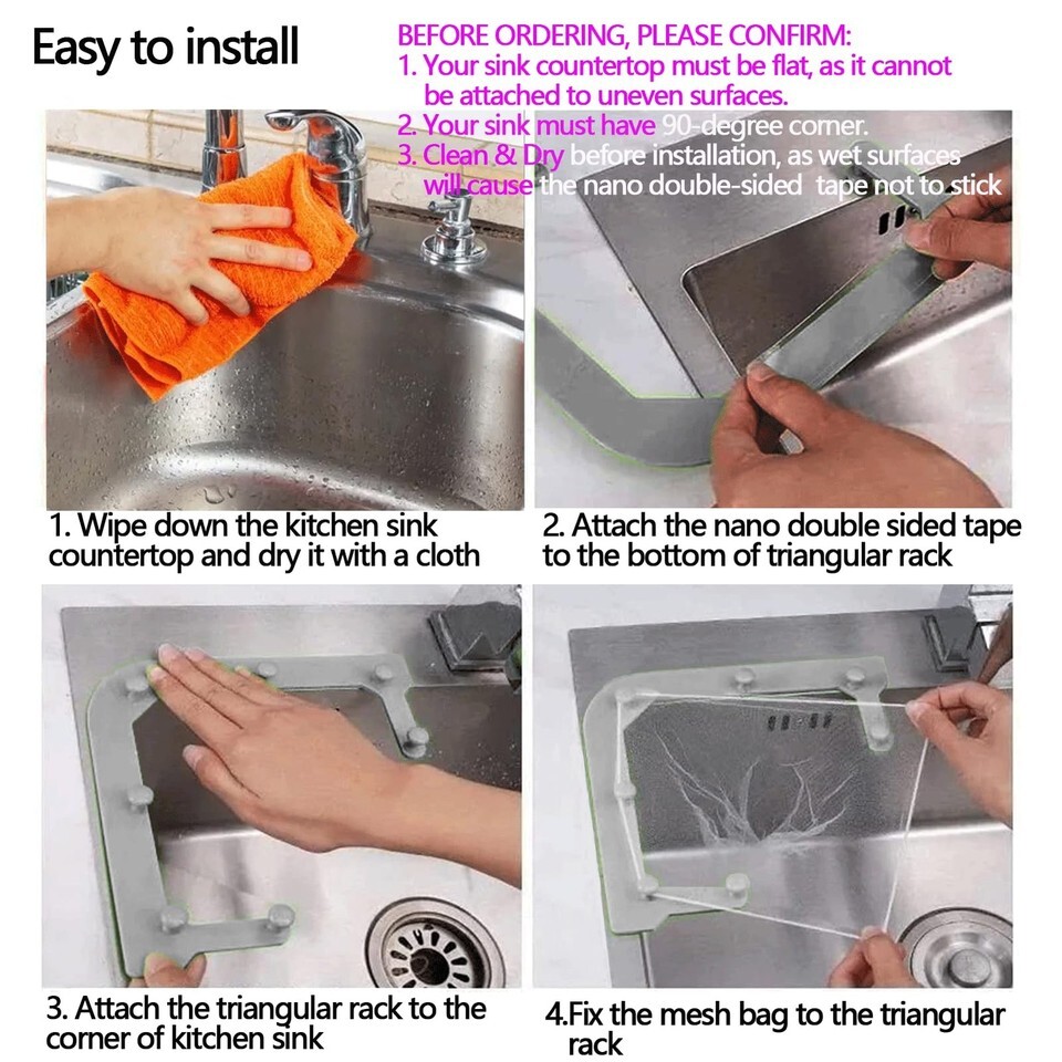 EASY TO INSTALL: The installation of this triangle filter is very simple, you just need to dry the countertop, attach the triangle rack to the counter top of kitchen sink with nano double-sided tape, and then fix the mesh bag to the triangle rack