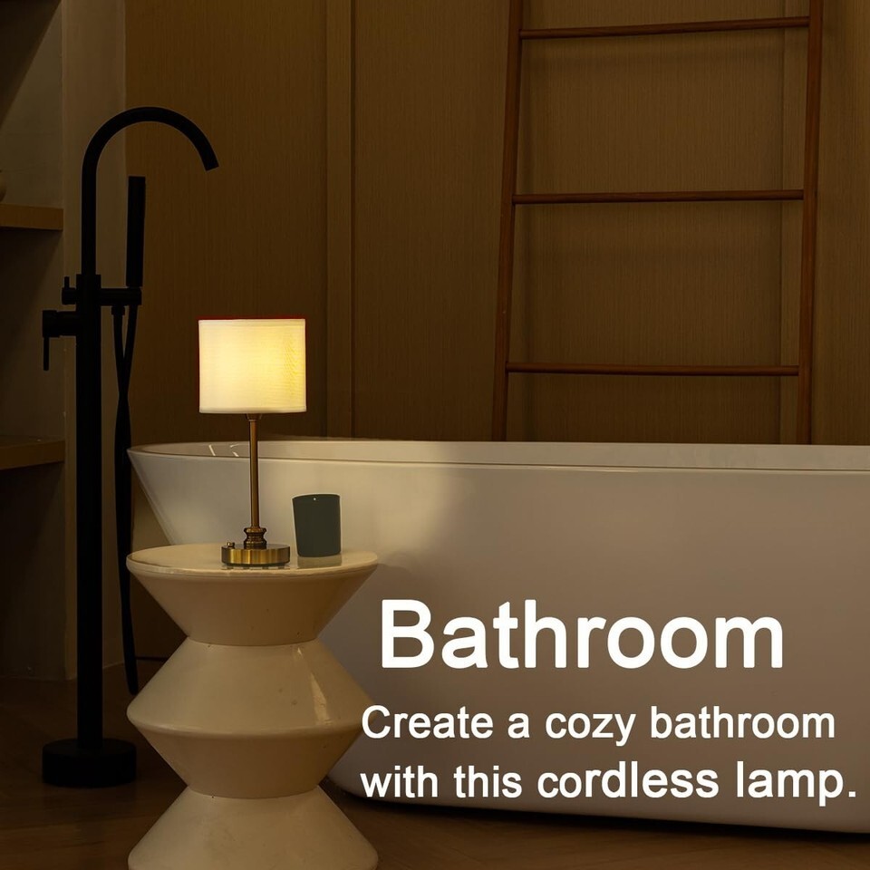 Inspired by 1950s lamps and a mood lighting which is soft and warm. Table lamp with a sturdy brass gold base topped with a white sturdy fabric shade..USB charging,cordless table lamp can be take to anywhere you want.Such a lovely lamp to decor your coffee table,dining table,side table or outside patio.